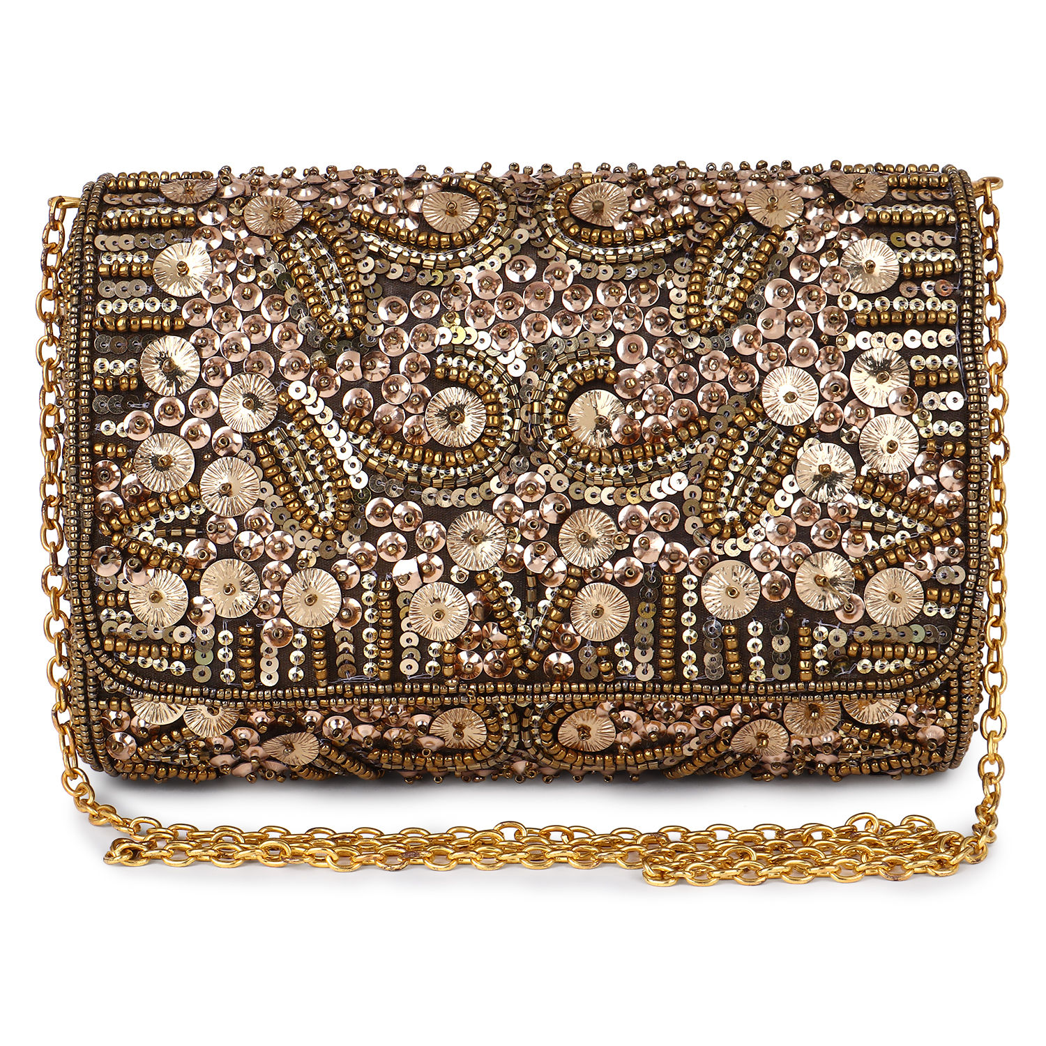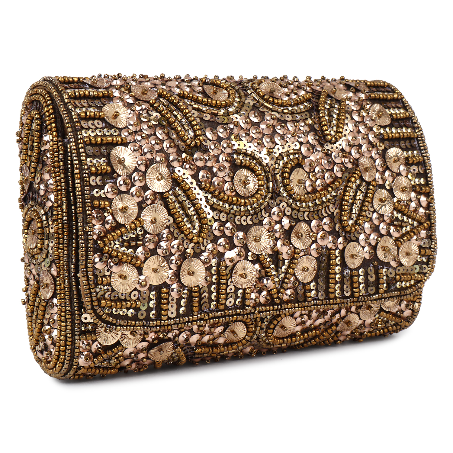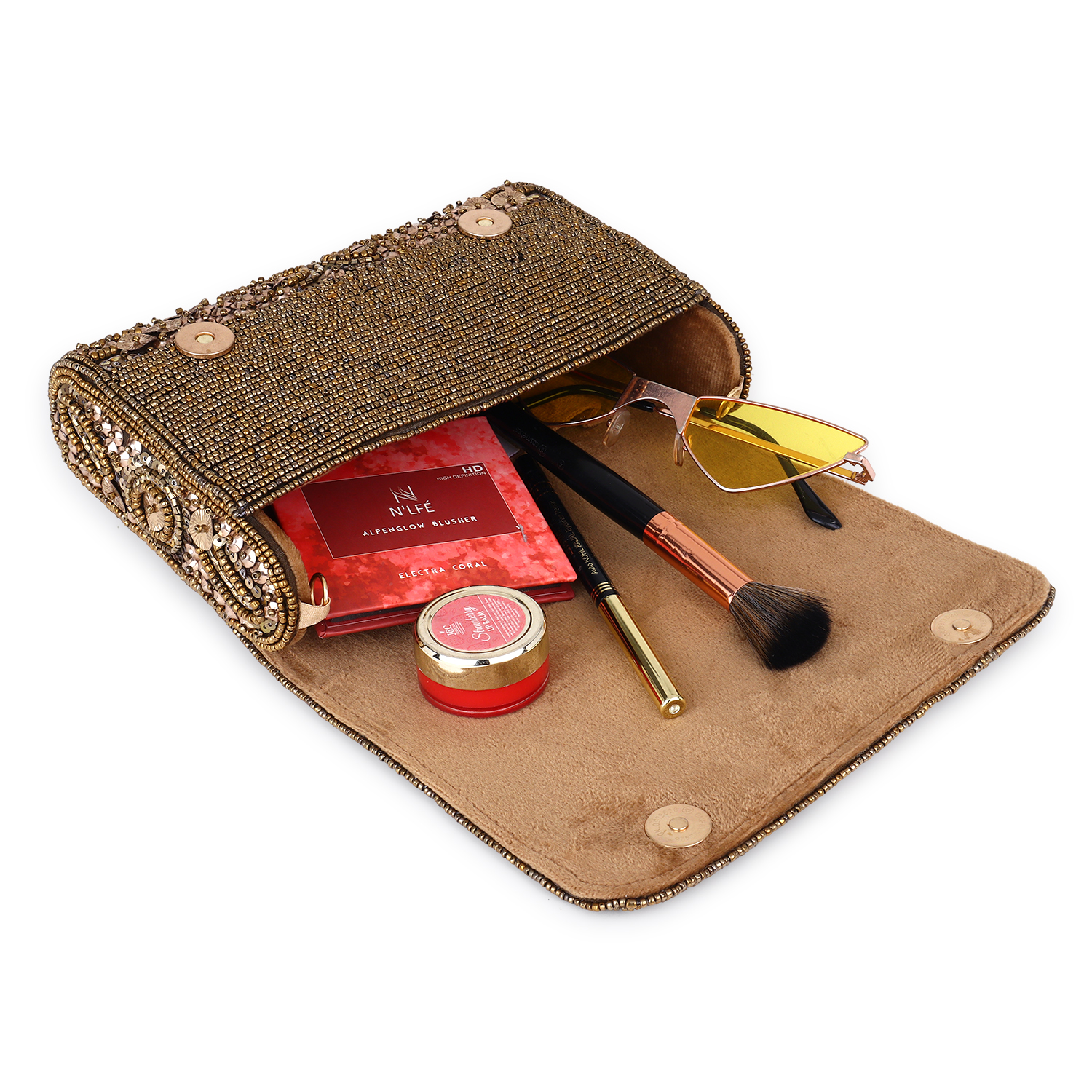 Adorn the rich statement piece Bronze burst 3 Fold bag, handcrafted with intricate antique gold beads and sequins. Add that dash of elegant sparkle to your outfit with this versatile and classic design for a glamorous evening out. Invest in yourself with this TN bag of happiness or gift this bag of joy to your loved one!