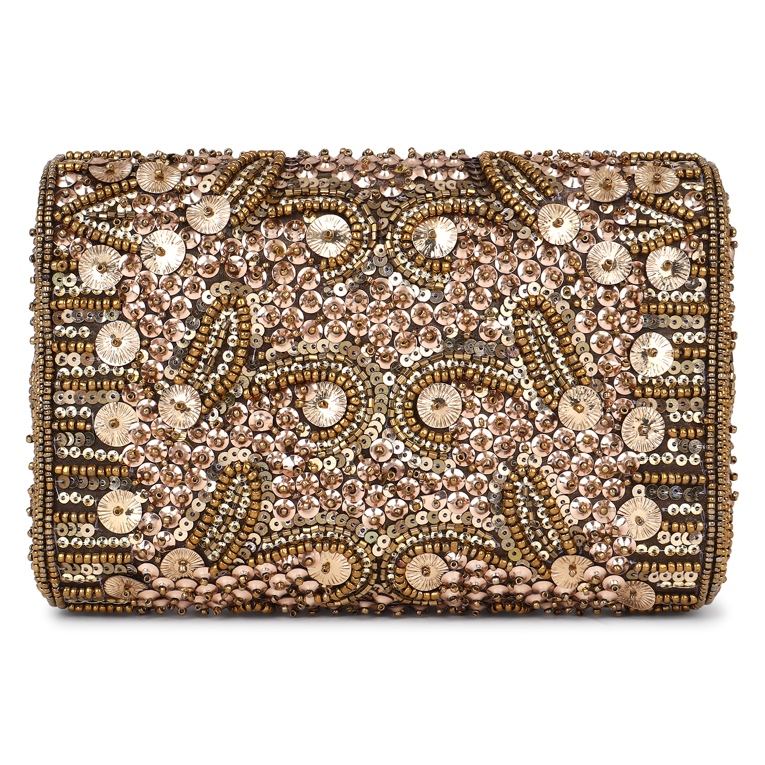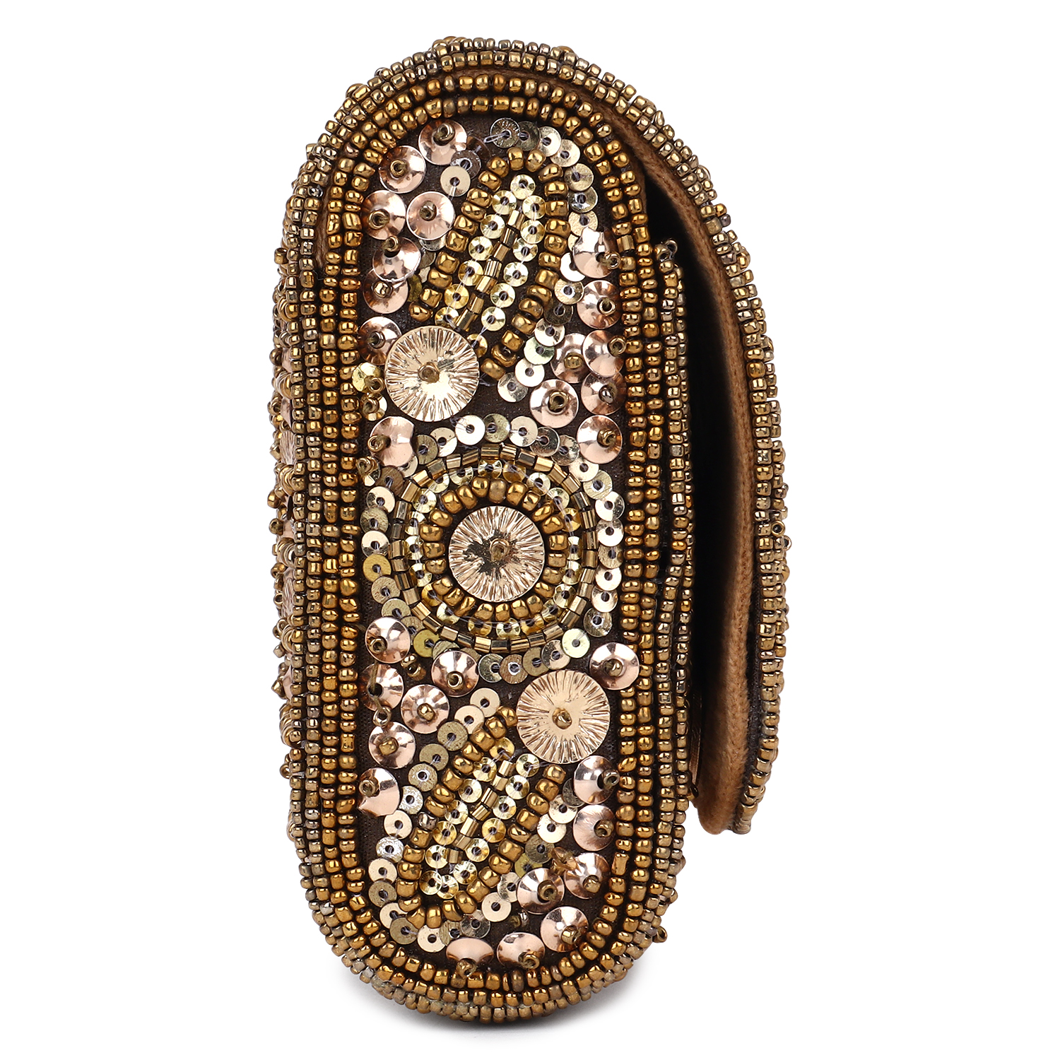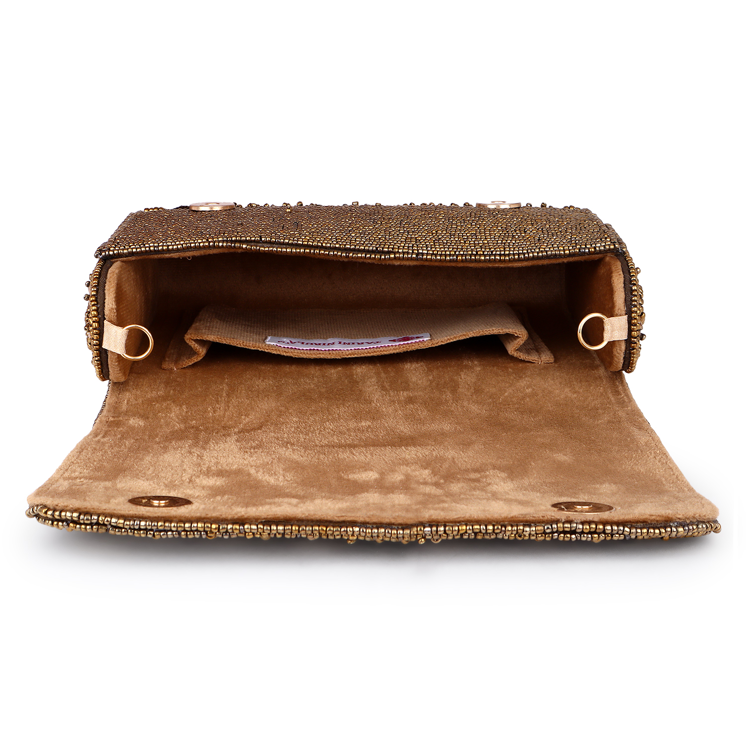 Adorn the rich statement piece Bronze burst 3 Fold bag, handcrafted with intricate antique gold beads and sequins. Add that dash of elegant sparkle to your outfit with this versatile and classic design for a glamorous evening out. Invest in yourself with this TN bag of happiness or gift this bag of joy to your loved one!