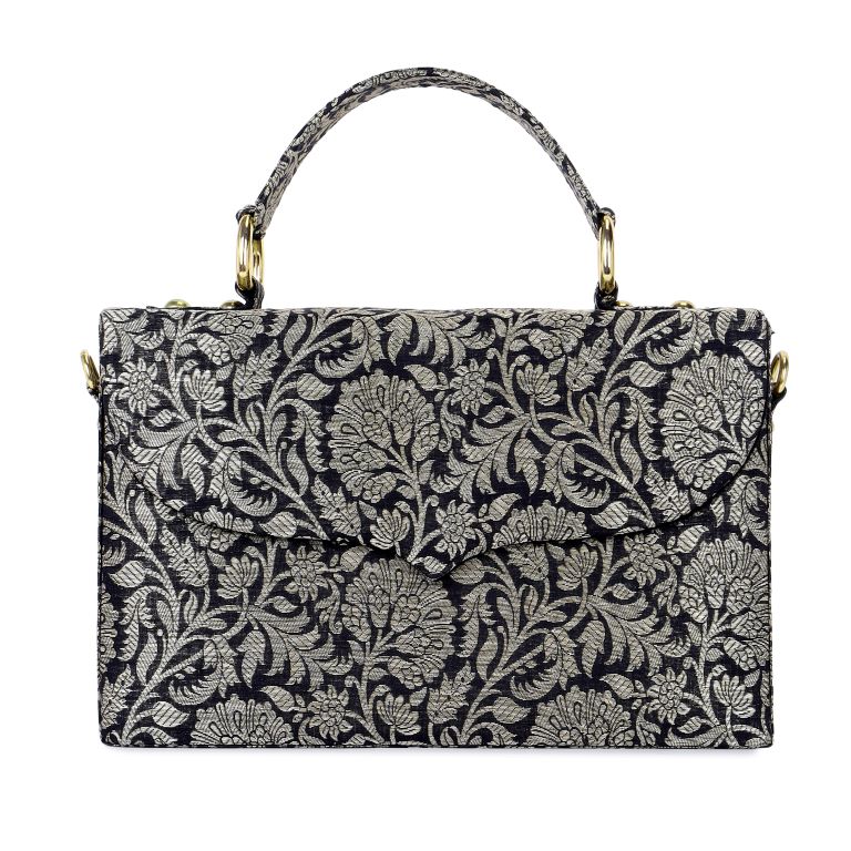 Designed in classic black and silver, this floral elegant brocade bag features a structured fold silhouette that lends a vintage-inspired yet international appeal. The bag is thoughtfully finished with a stylish top handle and a detachable gold-toned crossbody chain, allowing versatile styling from festive occasions to evening affairs. With sufficient space to hold your phone and daily essentials, Aira seamlessly blends beauty with functionality.