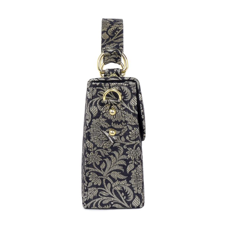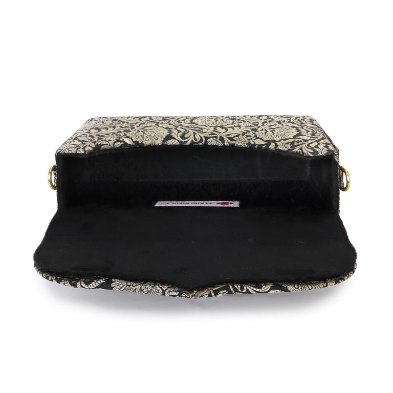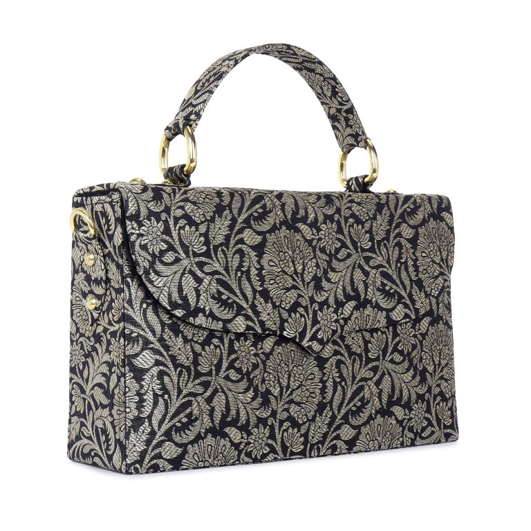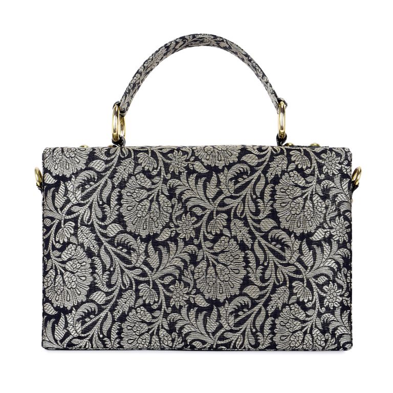 MATERIAL : Black & Silver Katan Floral Brocade, Black Suede Lining, Brocade Handle, Optional Detachable Crossbody Gold Chain with Brocade, Magnetic Lock, Will accomodate an i-phone 15 and more! This handcrafted product is ready to ship.