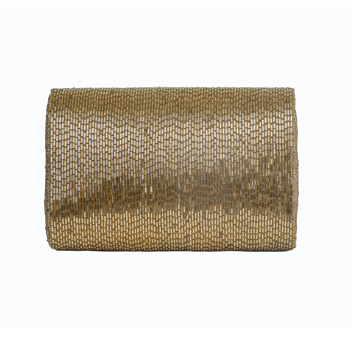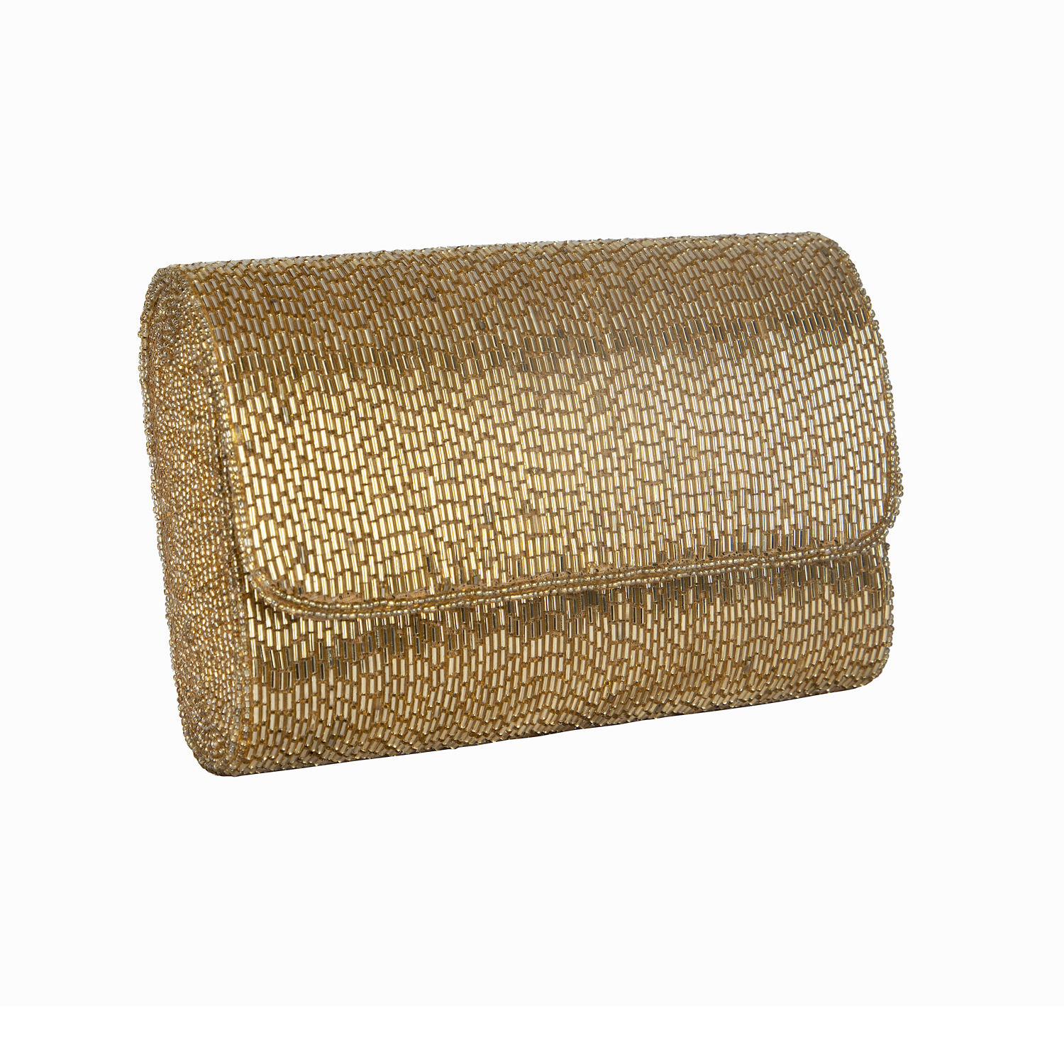 Adorn this classic 3 fold Camellia Satchel Bag in a striking Gold to add that touch of elegant sparkle. This designs showcases intricate beadwork handcrafted by the Indian artisan. This versatile design is ideal to carry with Indian, Western and Indo – Western outfits!