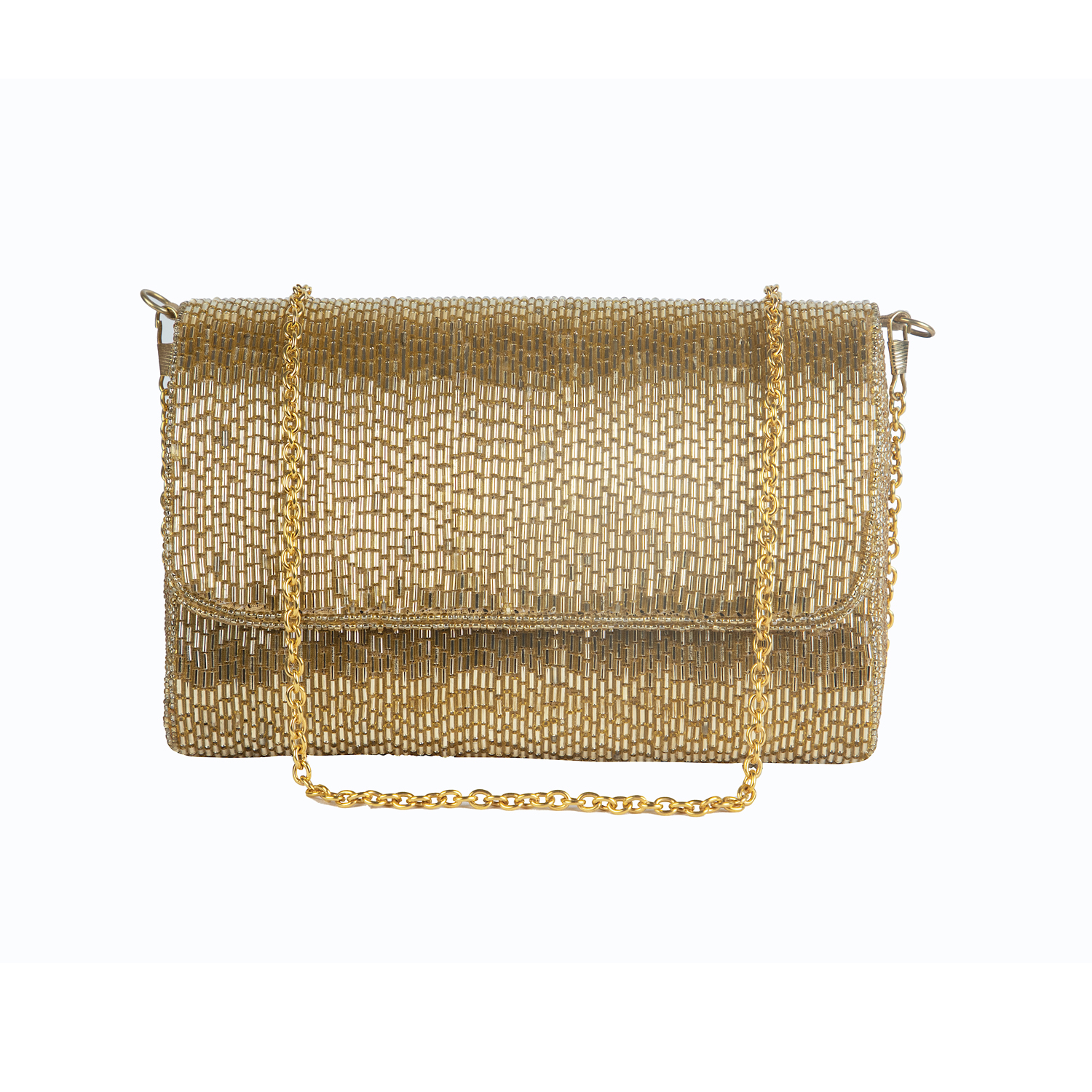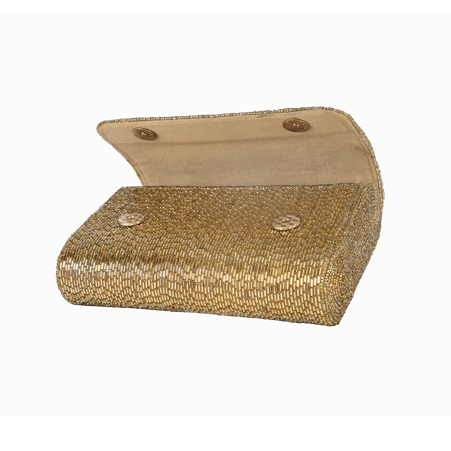 MATERIAL : Gold Beads, Gold Pipes, Lining Gold Poly Silk Fabric, Gold Chain, Magnetic Button. This handcrafted product is ready to ship.