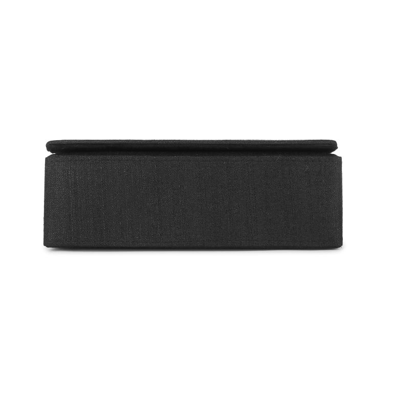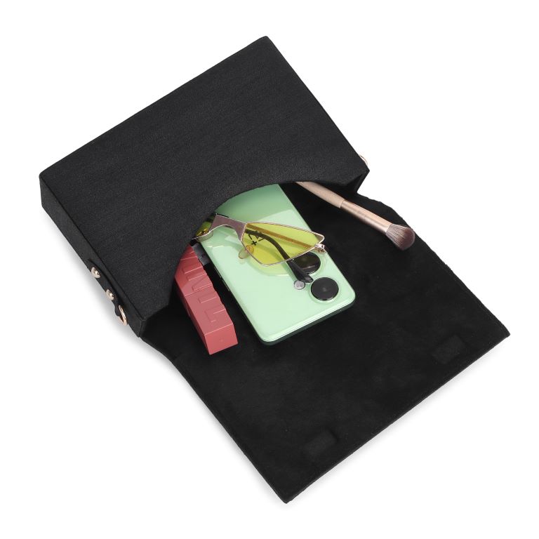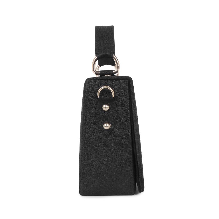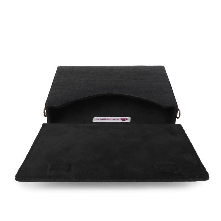 MATERIAL : Black Bhagalpuri Silk Base Fabric, Gold Beads, Aari Thread work in Shades of Gold, Black Suede Lining, Brocade Handle, Optional Detachable Crossbody Gold Chain with Brocade, Magnetic Lock, Will accomodate an i-phone 15 and more! This handcrafted product is ready to ship.