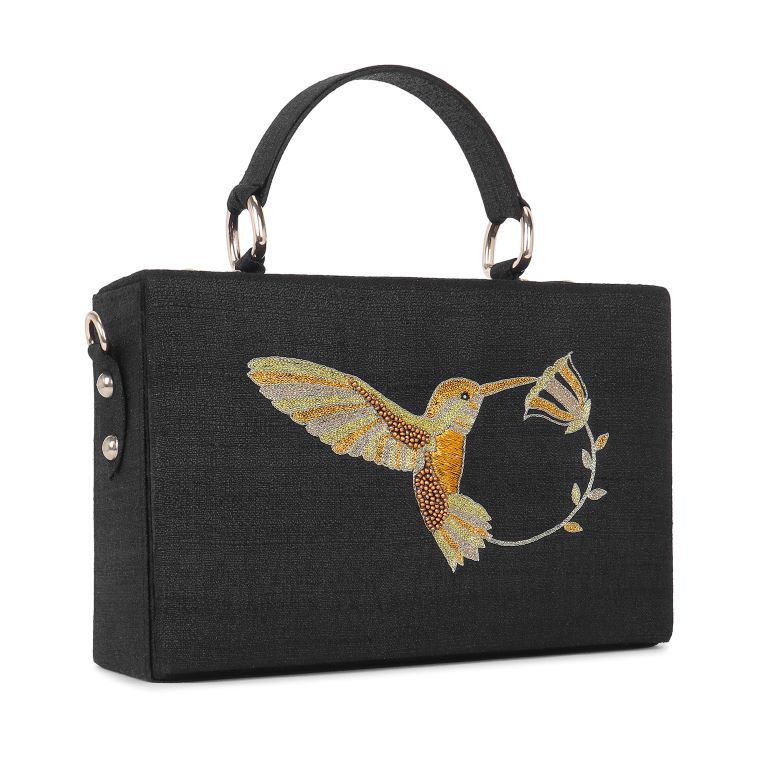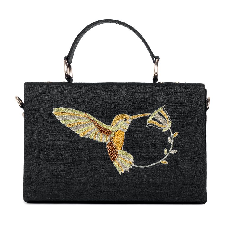 Set against a deep black base, the hummingbird is rendered in striking shades of gold, brought to life through intricate Aari embroidery, fine threadwork, and delicate beadwork. Every detail—from the gentle curve of its wings to the calm, expressive eyes—has been carefully handcrafted by skilled Indian artisans, transforming this minaudière into a wearable work of art.