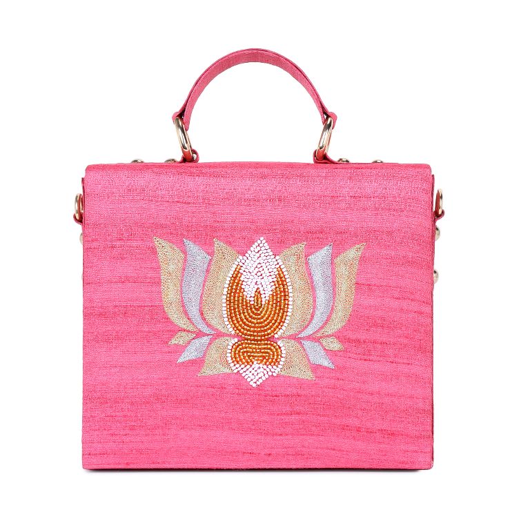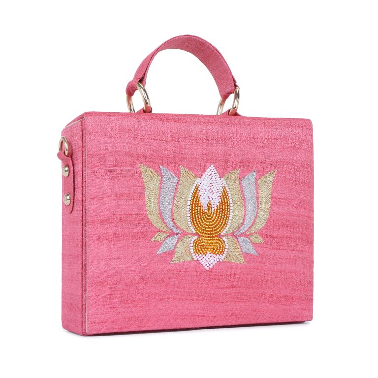 Finished with a structured silhouette, a refined top handle, and a detachable crossbody chain, the Lotus Sutra Pink minaudière is thoughtfully sized to carry your phone and essentials with ease. Perfect for festive occasions, weddings, and Indo-Western ensembles, this limited-edition design is a TN bestseller, cherished for its craftsmanship, elegance, and timeless appeal.