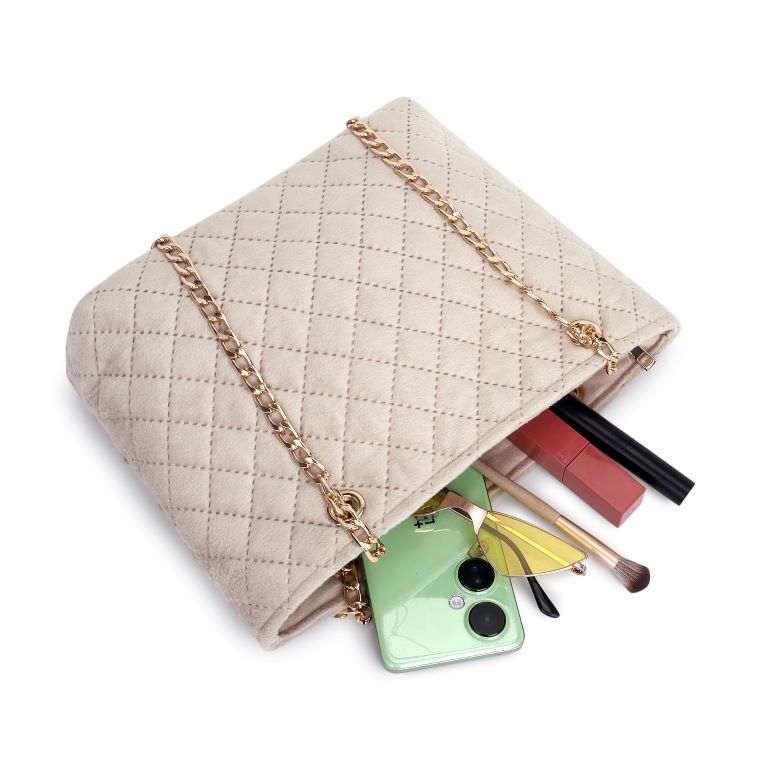 The finely quilted texture adds depth and structure, while the gold-toned chain strap introduces a subtle contrast that elevates the design. Carefully crafted to balance beauty and functionality, the bag offers ample space for your phone and everyday essentials, making it a graceful companion from day celebrations to evening occasions.