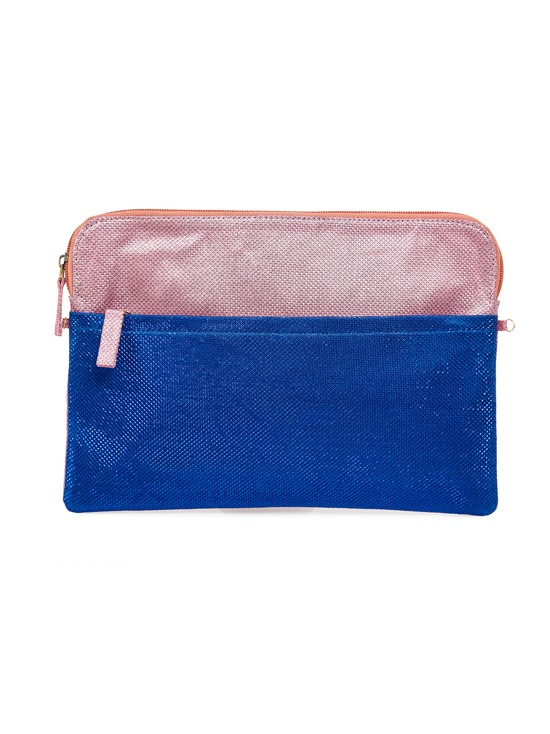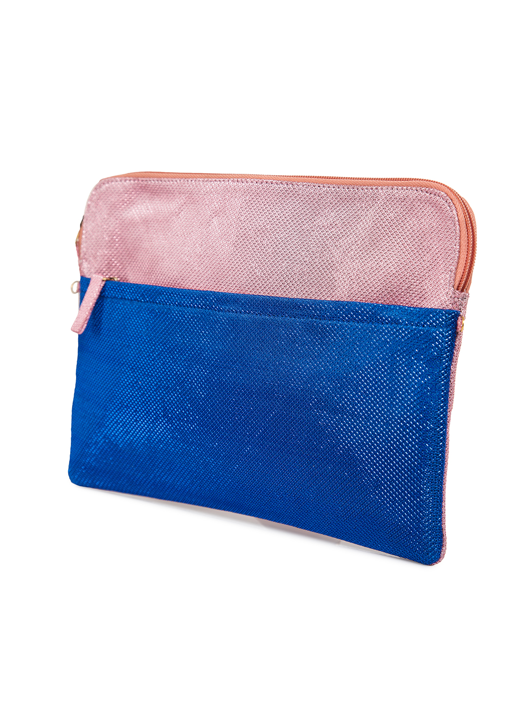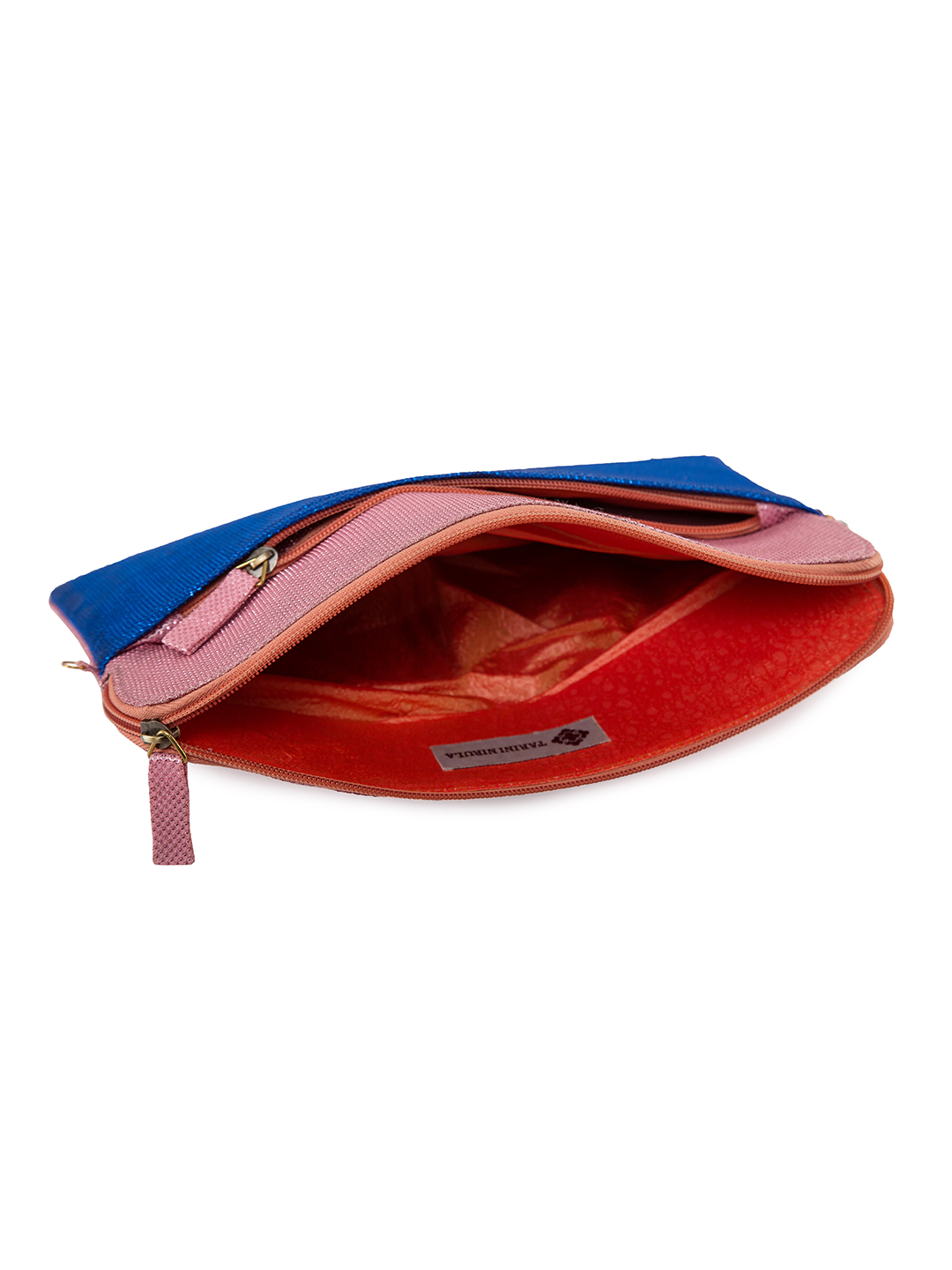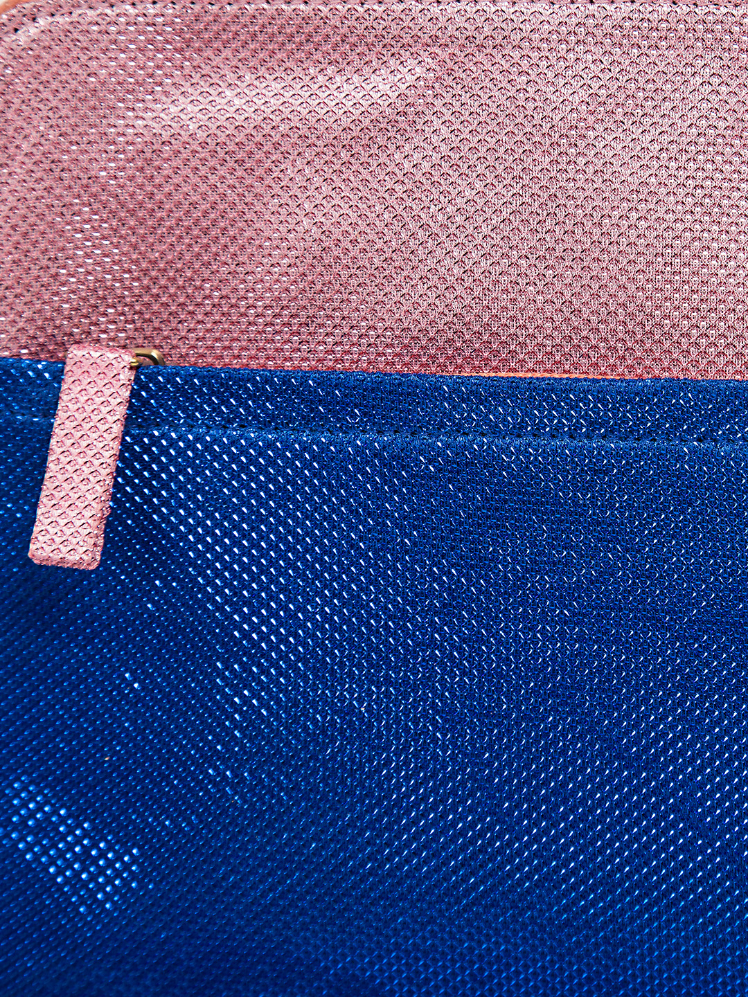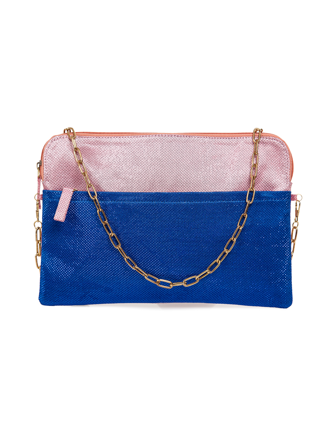 MATERIAL : Pink And Blue Sparkle Jersey Knit Fabric, Gold Chain, Orange Lining, Light Pink Zipper, spacious enough for your essentials and more!