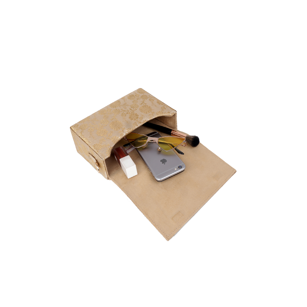 MATERIAL : Pearl Beads, Gold Base Fabric, White Gold Brocade, Beige Suede Lining, Optional Cross Body Gold Chain, Will accomodate an i-phone 14 and more! This handcrafted product is ready to ship.