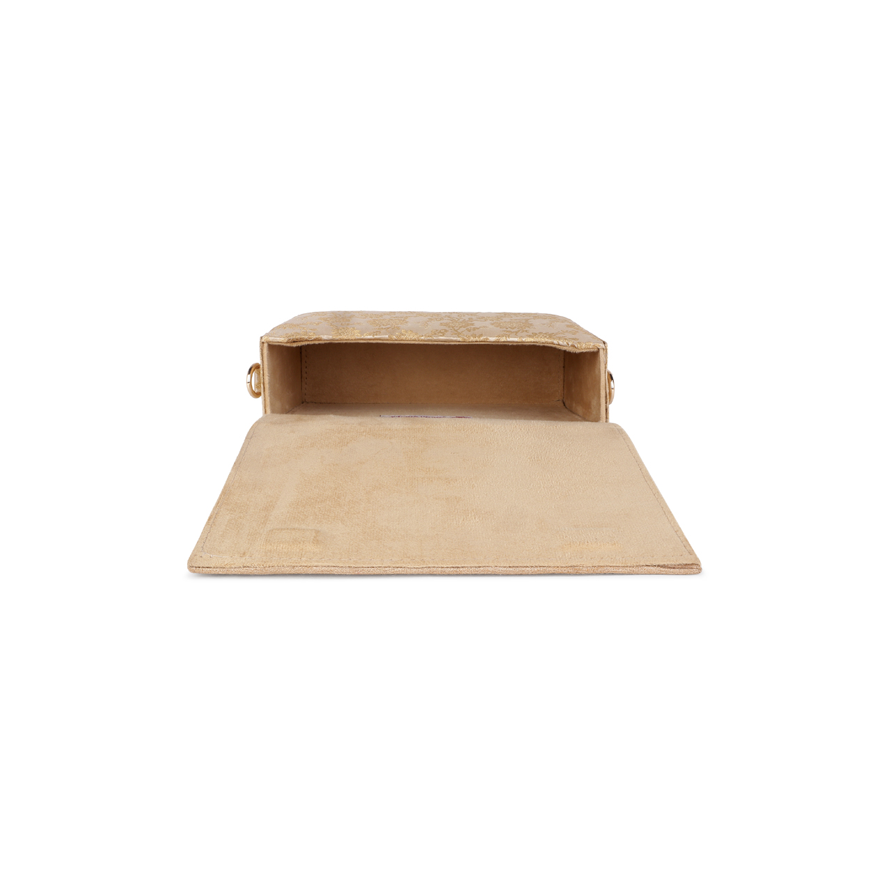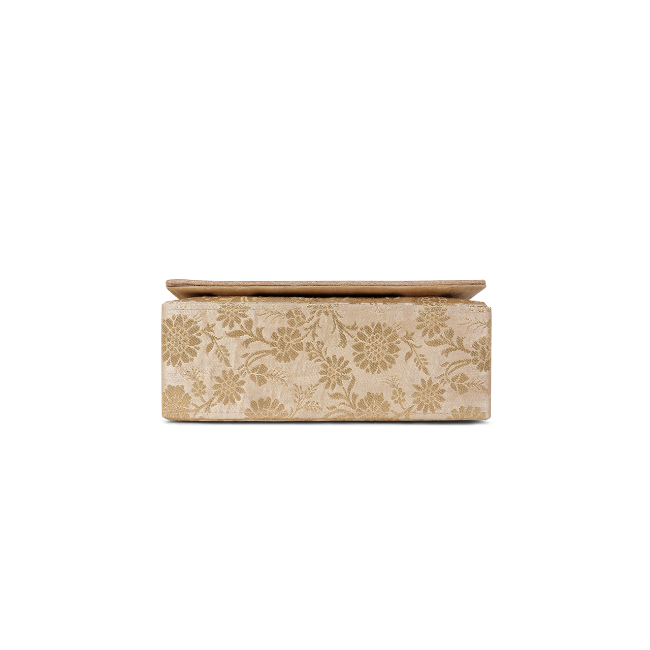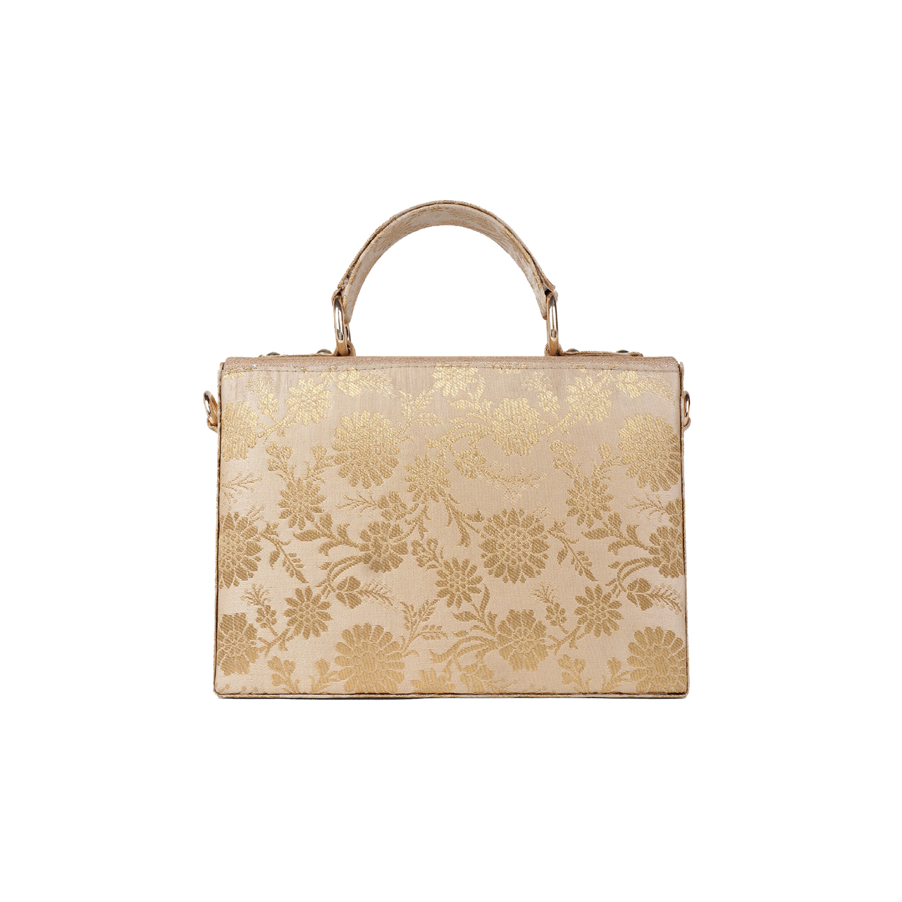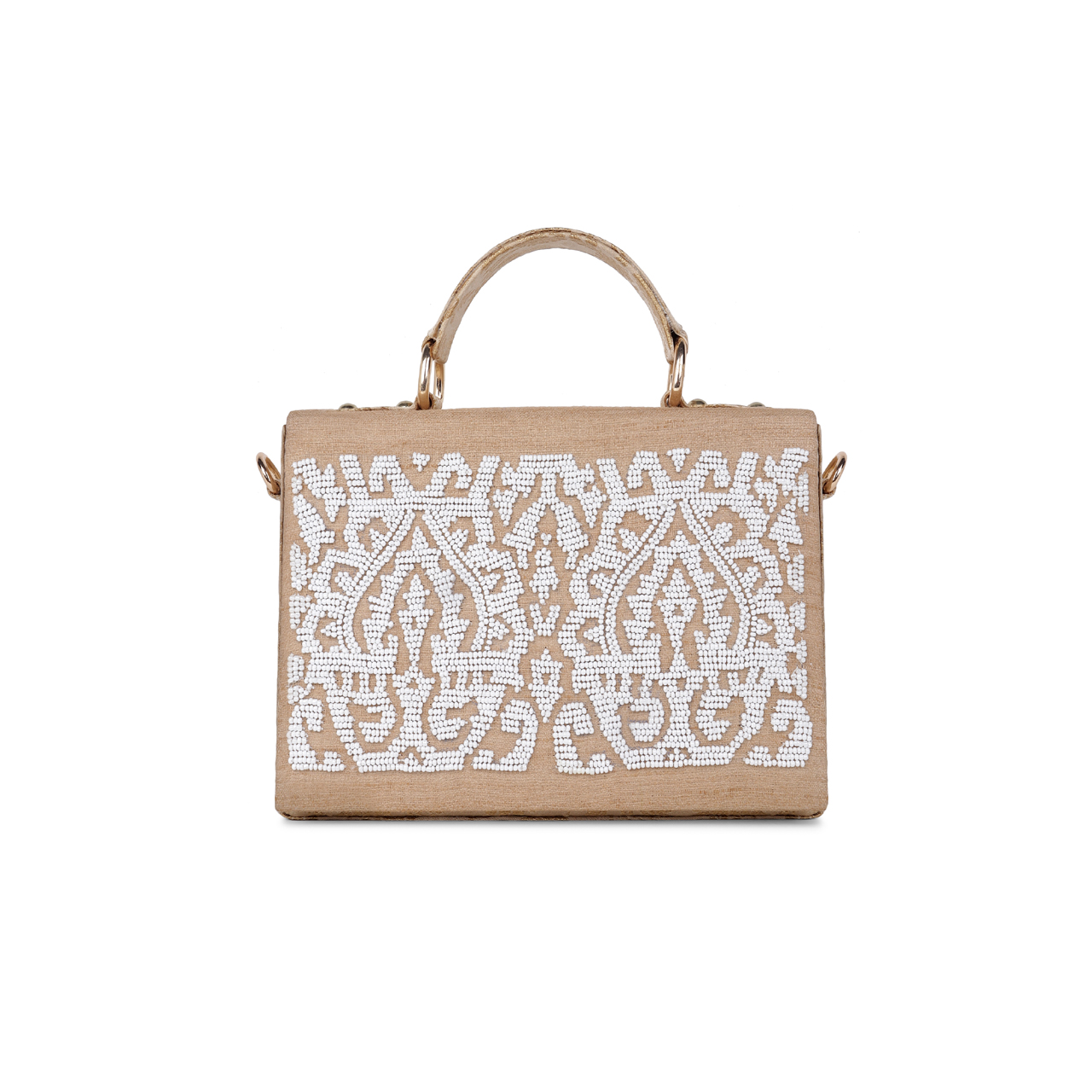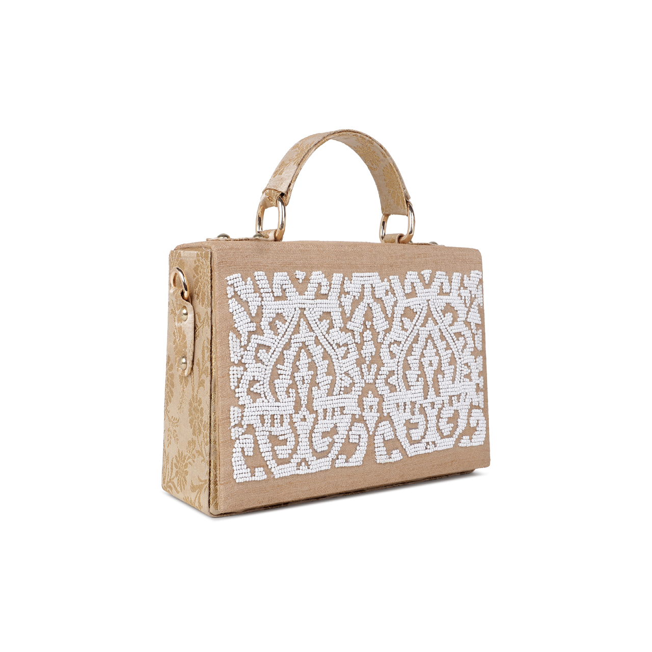 Inspired by the beauty of the royal Amer Fort in Jaipur, make heads turn with the exquisite Amer Regal Minaudiere, to be adorned with flawless style. In this two toned design, each pearl bead has been intricately stitched by hand by the Indian craftsman to create a beautiful pattern inspired by wall art patterns at the royal fort. Perfect for a wedding or evening out! Heavy handwork on one side with a beautiful, rich peach gold brocade on the other side, making this a 2 in 1 collector’s piece in your wardrobe.