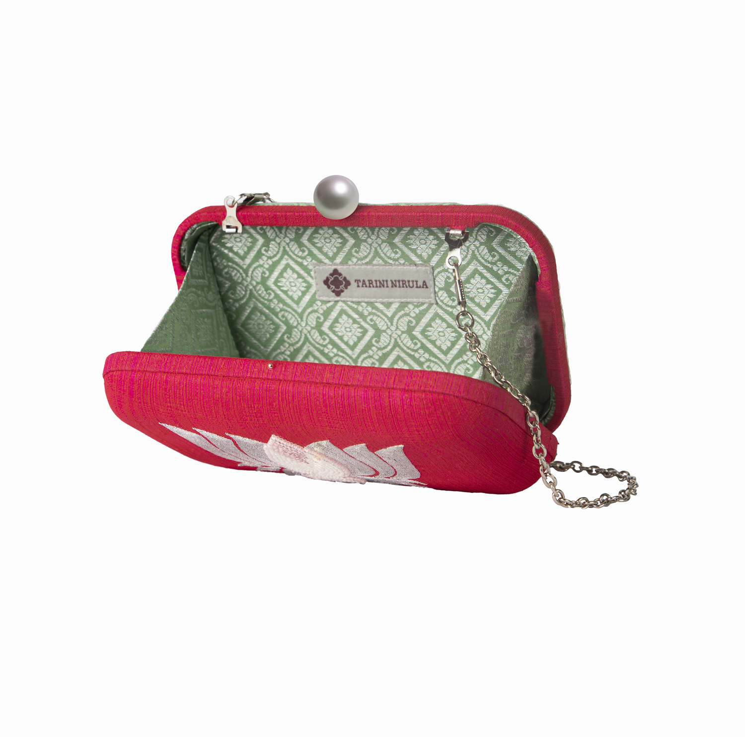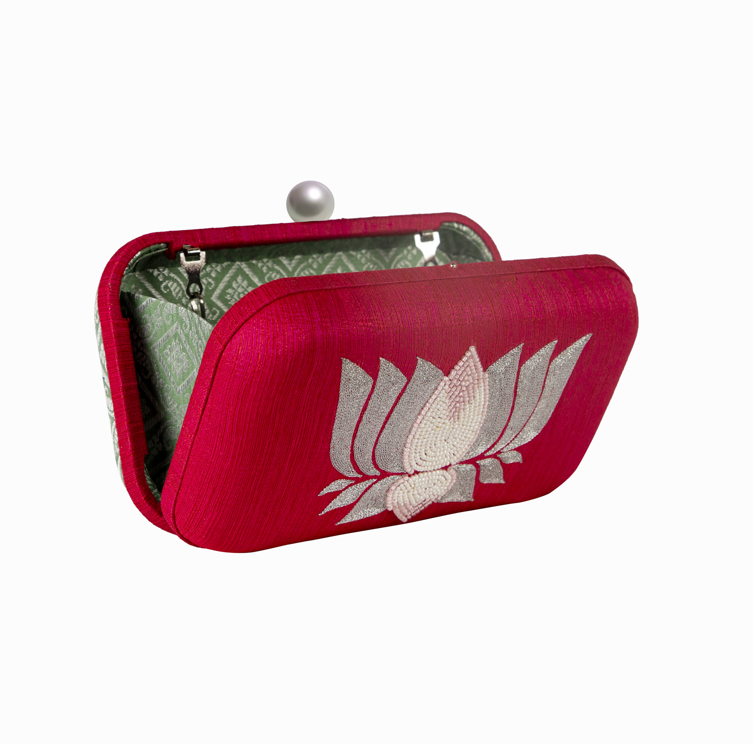 An elegant statement piece minaudiere inspired by the timeless beauty of the Lotus, makes for a true blend of ethnic and contemporary design. This piece showcases intricate pink and white glass beads with silver Aari work against a rich rani pink. Handwork on one side. Limited edition design.