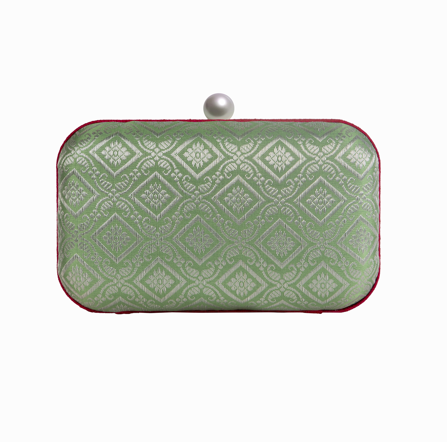 An elegant statement piece Minaudiere inspired by the timeless beauty of the Lotus, makes for a true blend of ethnic and contemporary design. This 2 in 1 design showcases intricate pink and white glass beads with silver Aari work against a rich rani pink base. With detailed handwork on one side, a beautiful pastel green brocade on the other, this is a Limited edition design.