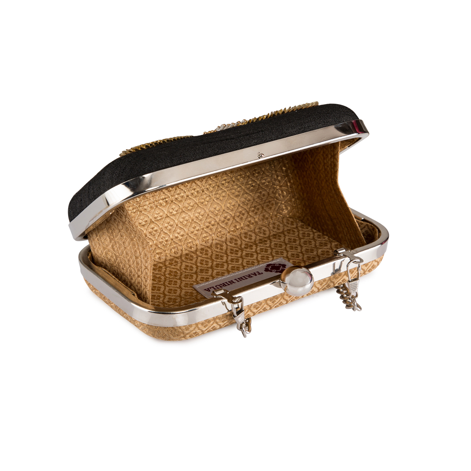MATERIAL : Silver Glass Beads, Gold Sequins, Silver pipes, Black Fabric, Gold Poly-Silk lining (Inner lining is subject to change), Silver Frame With Round Clasp.This handcrafted product is ready to ship.