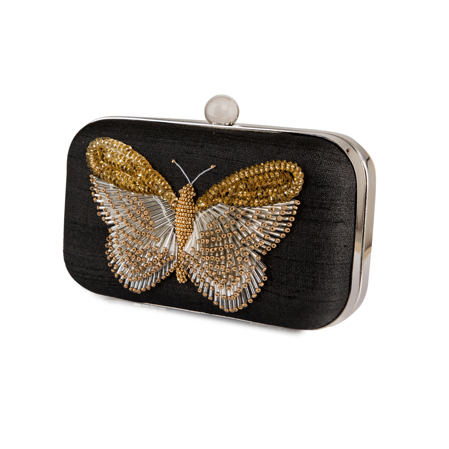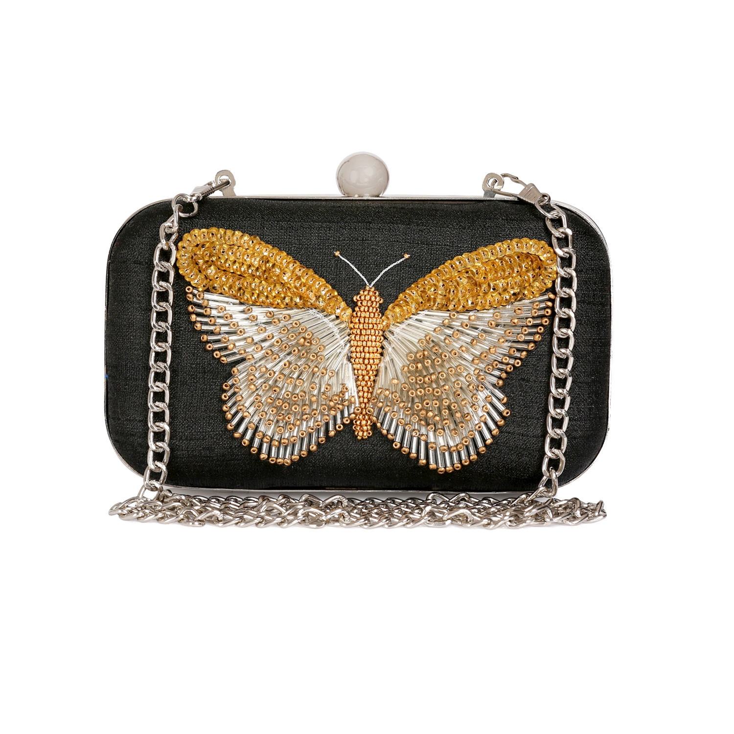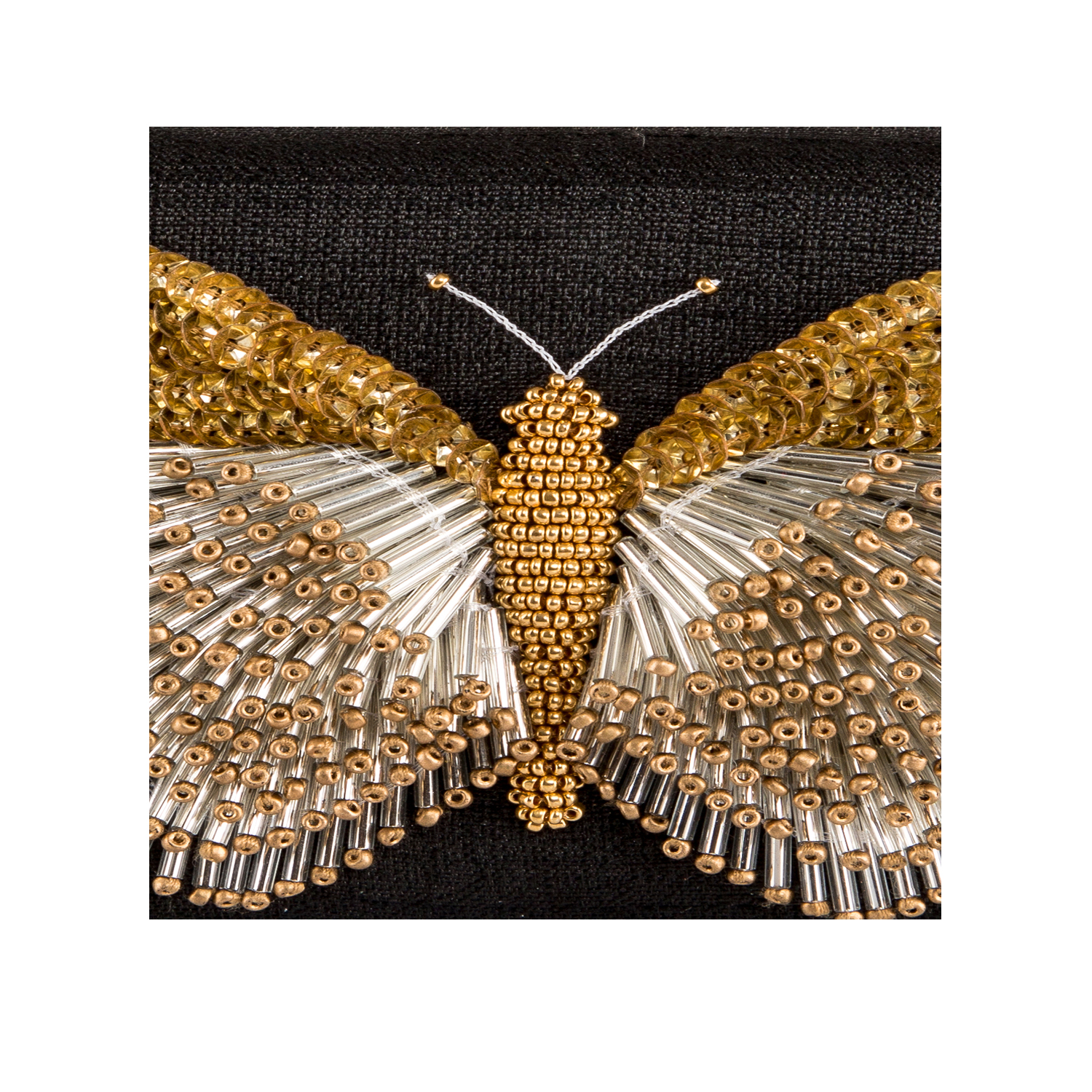 A beautiful embellished butterfly perched on the ‘Tropical Bliss antique gold and silver minaudiere represents hope and transformation. Each sequin and silver pipe with an antique gold glass bead attached on top, has been stitched on intricately at different angles. This striking butterfly is a reminder of the beauty and love that exists within each one of us. Heavy handwork on one side. Limited Edition design.