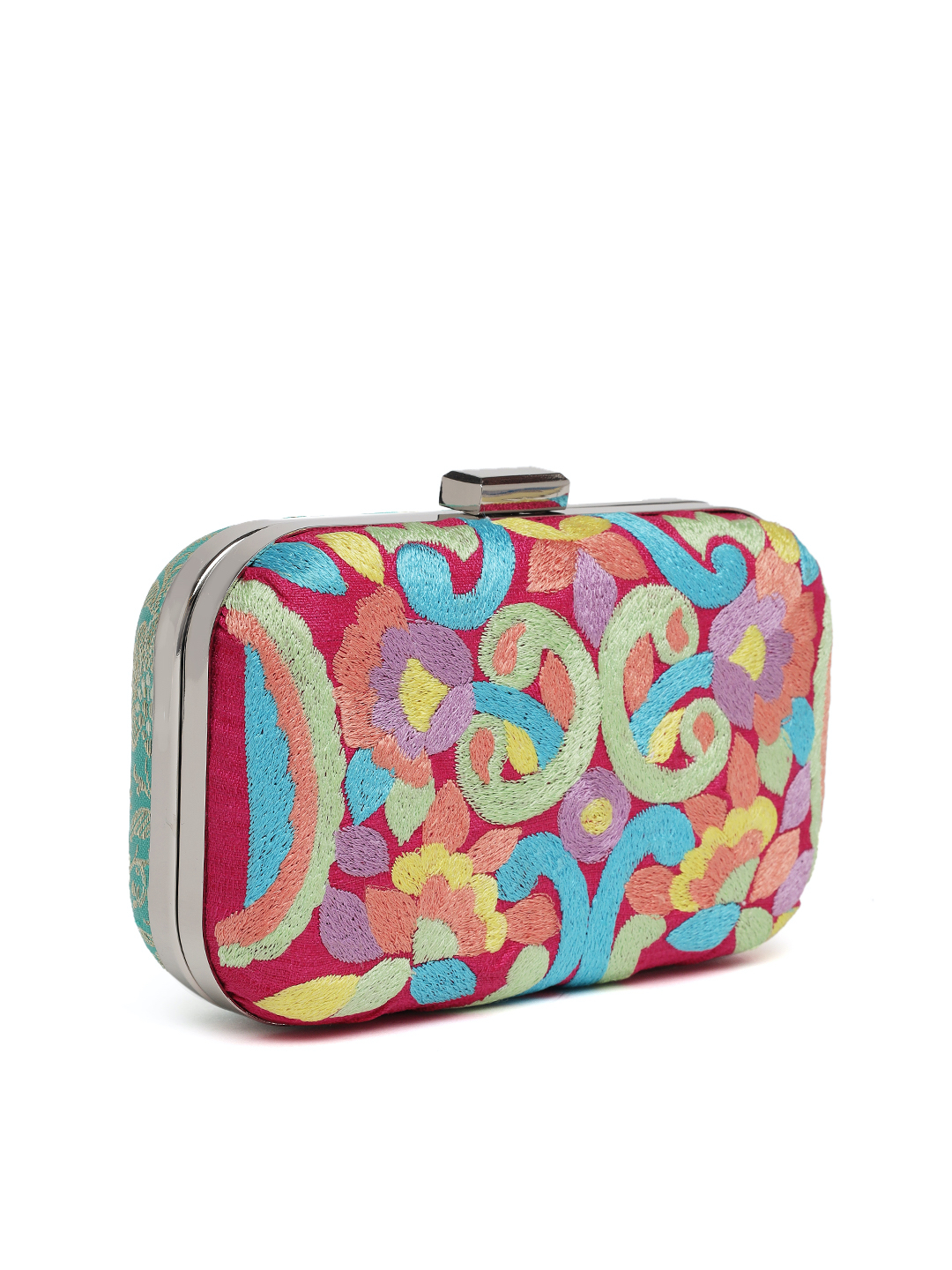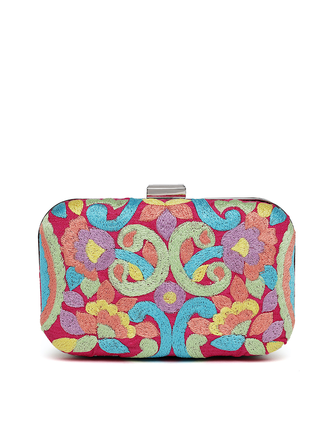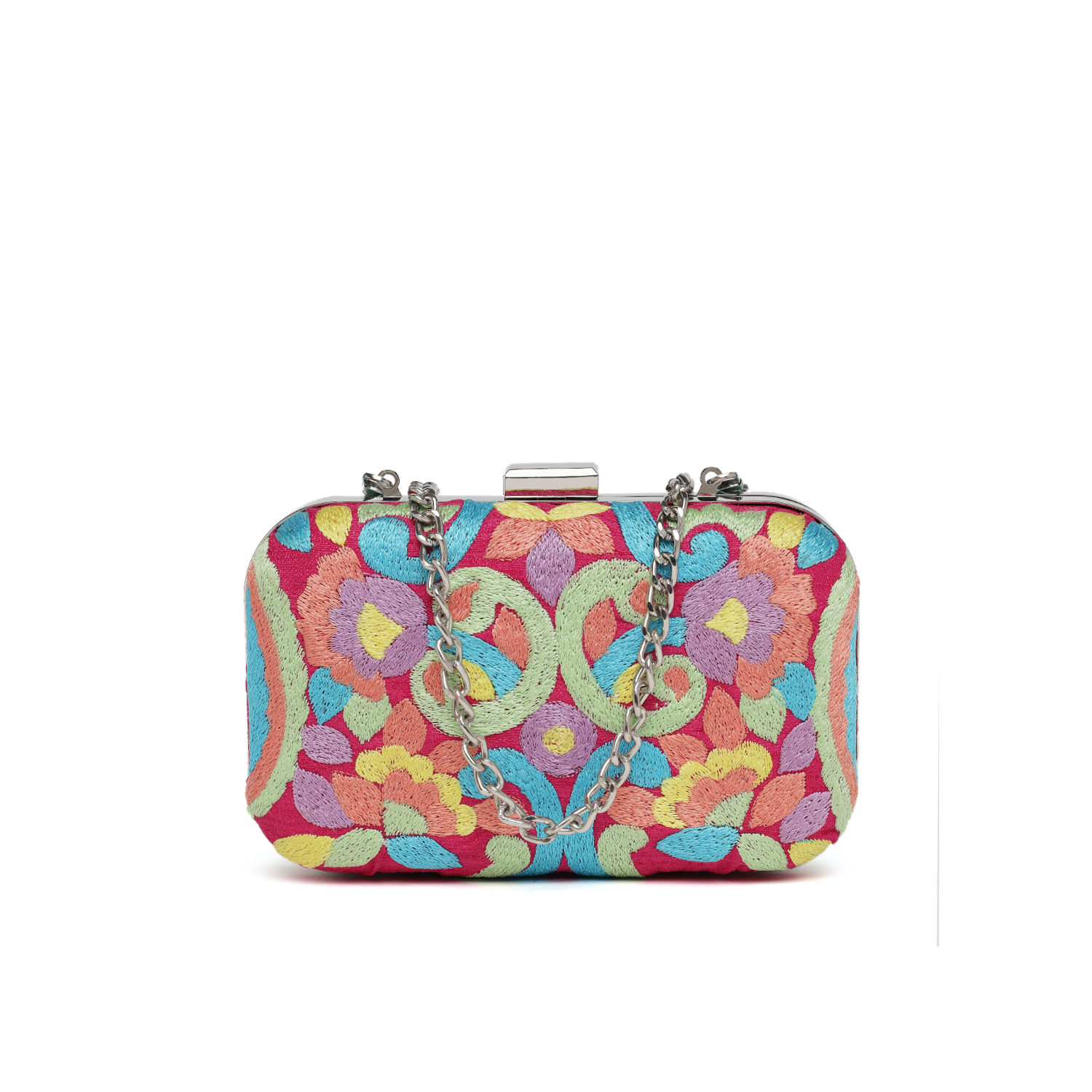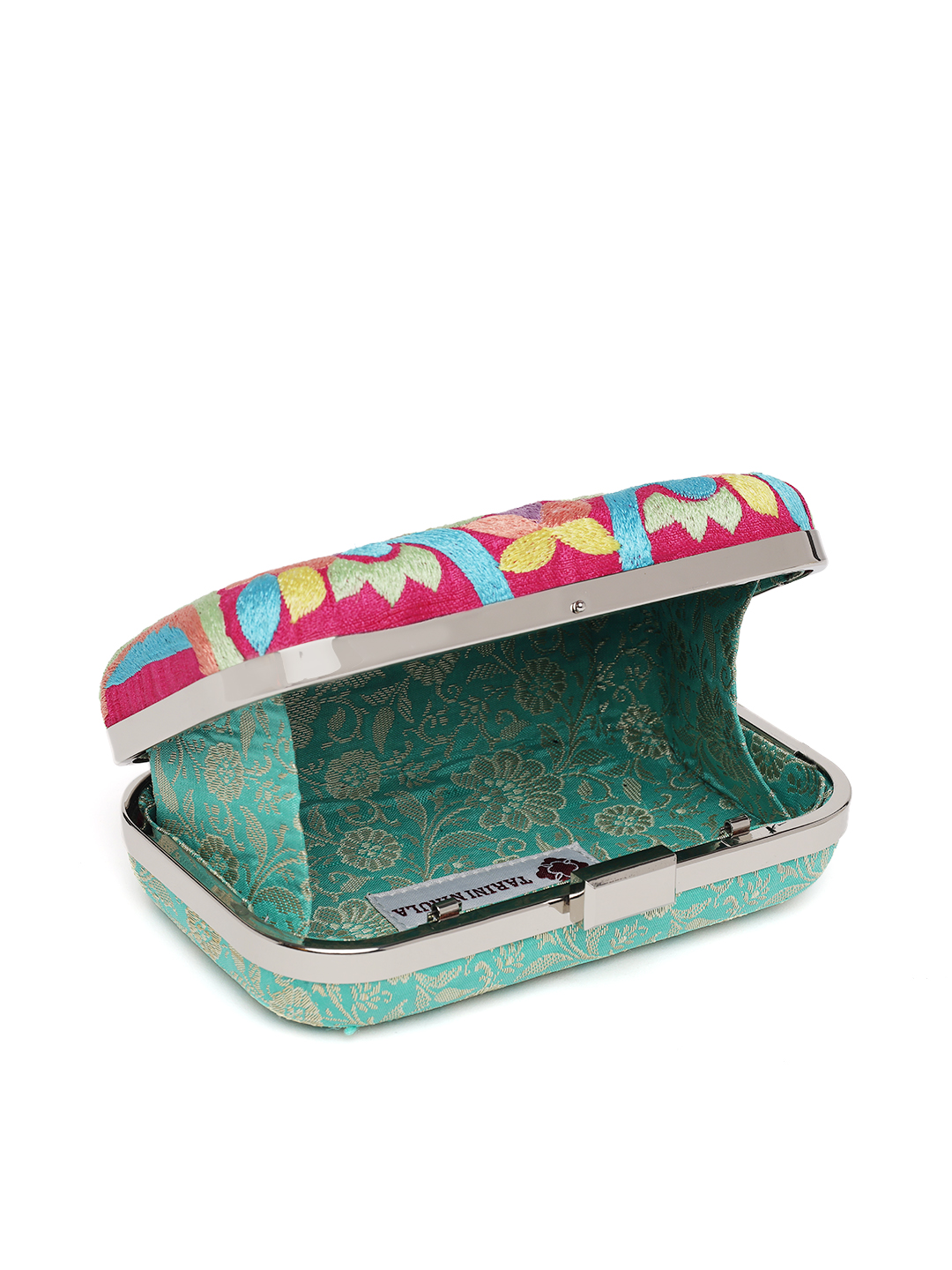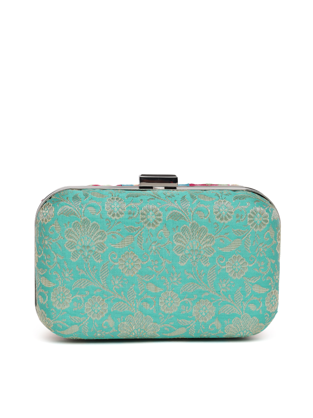 An embroidered garden of floral beauty, in spectacular shades of pastel thread work. Make heads turn with the statement piece 2 in1 Gardenia Minaudiere, to be adorned with flawless style. With beautiful embroidery on one side and a rich silver green brocade on the other, this versatile design is ideal for gifting a loved one or for a cocktail brunch out with friends