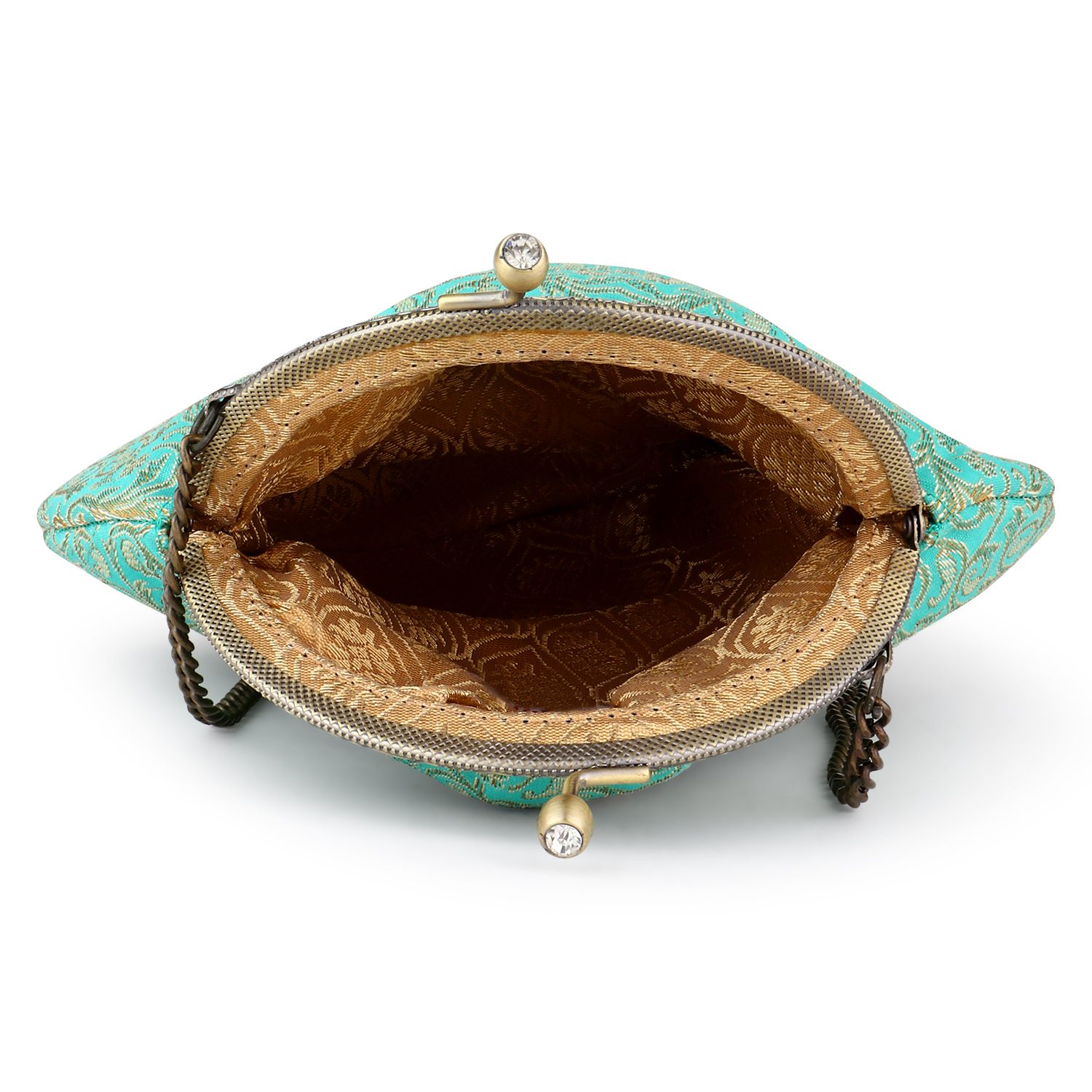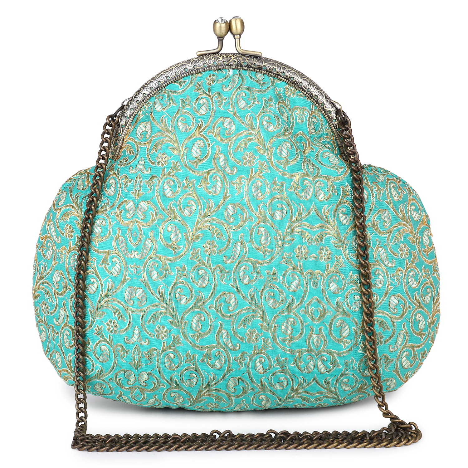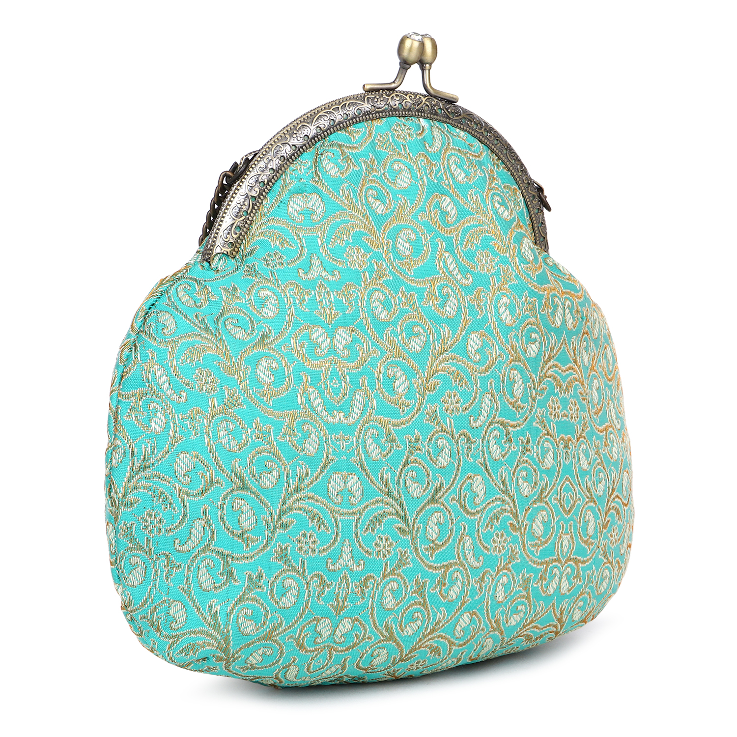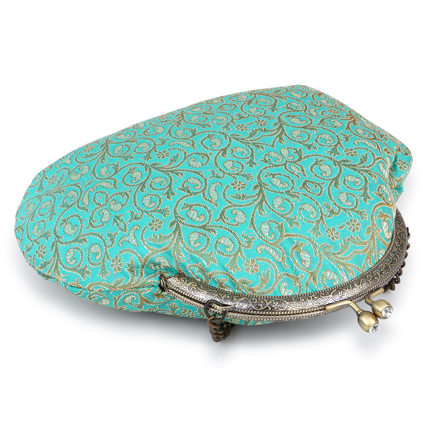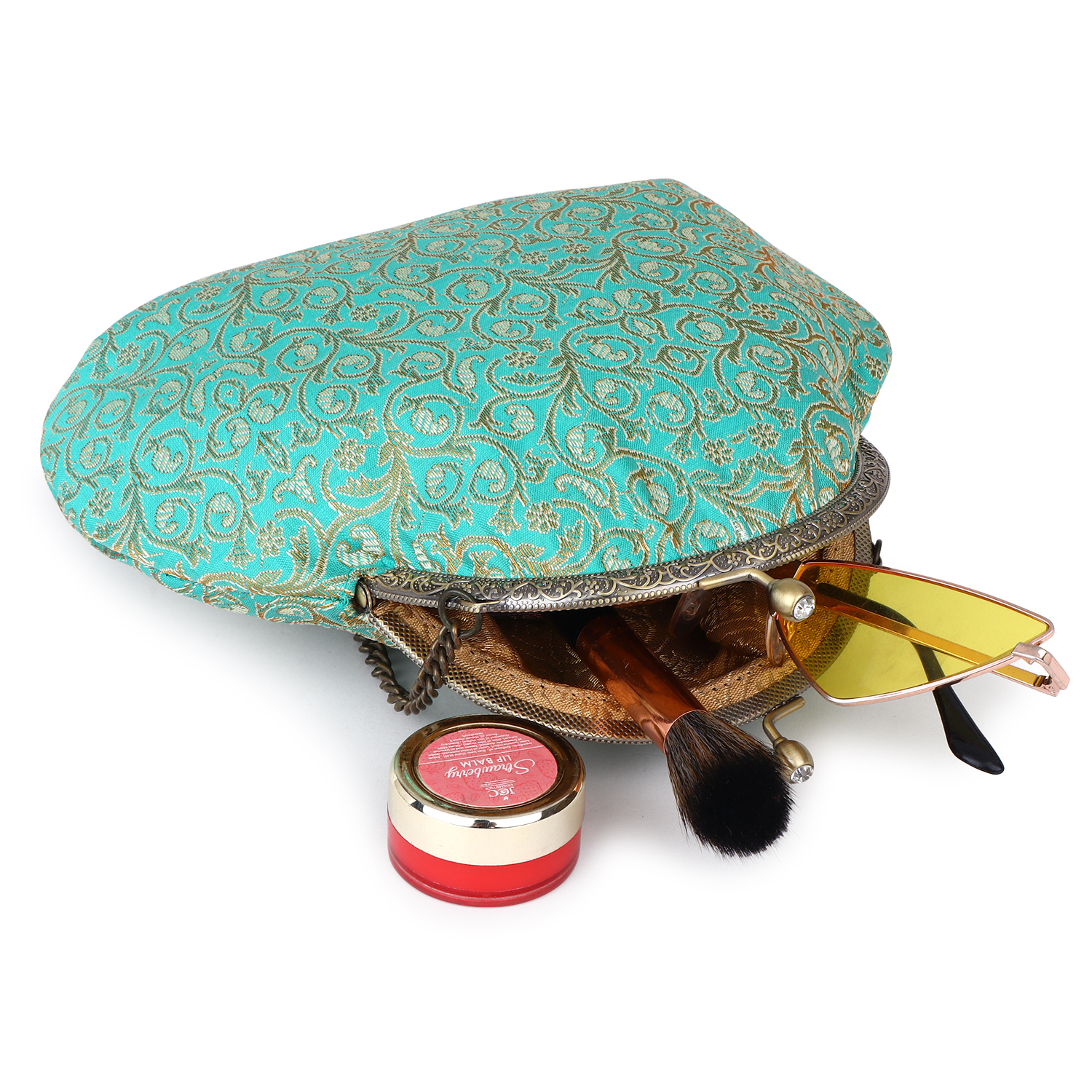 MATERIAL : Teal, Ivory and Gold Floral Brocade Fabric, Gold Brocade Lining, Antique Gold Chain, Vintage Antique Gold Frame with Round Clasp encrusted in a silver stone, Will accomodate an i-phone 14 and more! This handcrafted product is ready to ship.