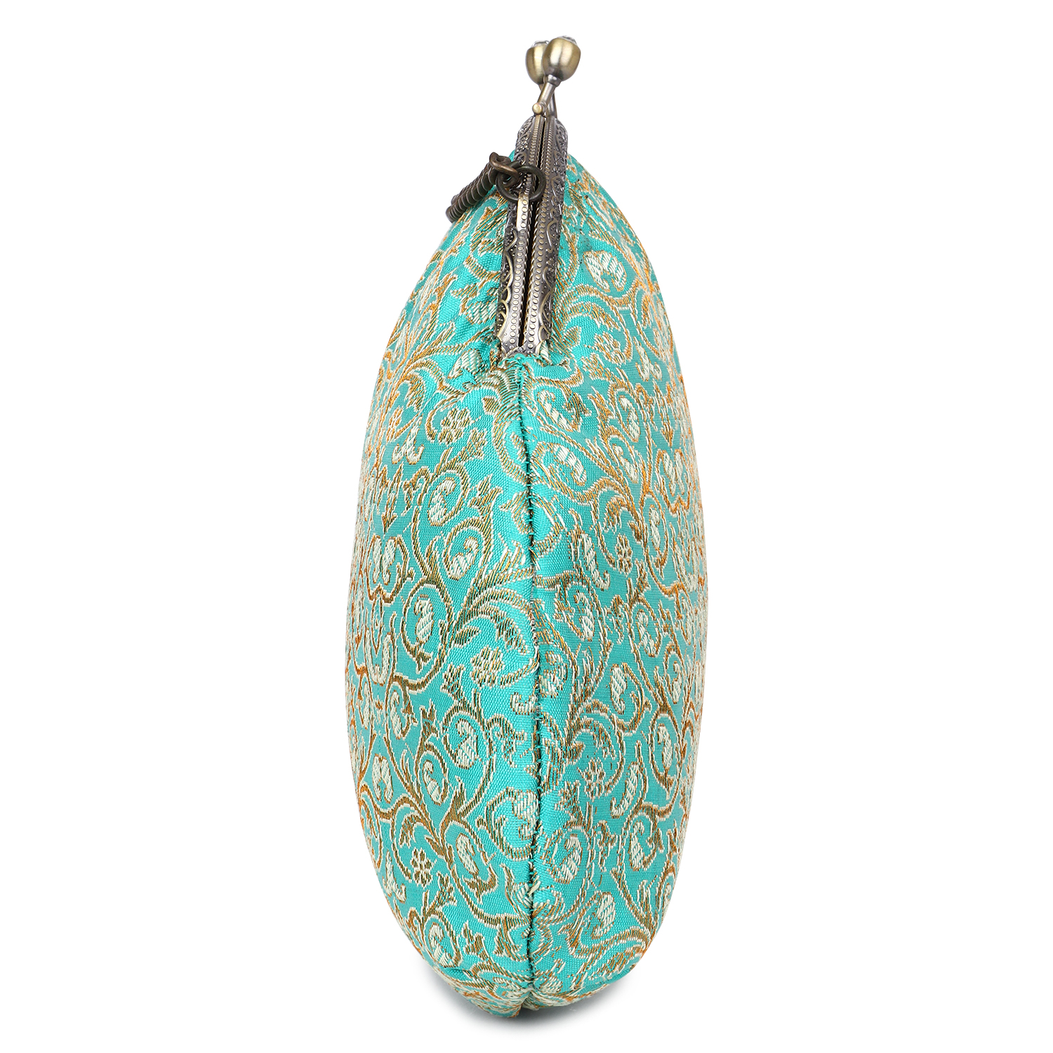 Inspired by the beautiful handcrafted Vintage Azalea Purse carried by Actress Deepika Padukone in the Bollywood movie 83, the Vintage Araa Teal handcrafted Pouch is inspired by the ethereal beauty of fragrant flowers. This elegant and versatile design is ideal to carry with an Indian or Indo-Western outfit. With enough space to carry your phone and your essentials, the pretty shades of ivory, teal and gold blend together to add a vintage classic touch to your outfit!