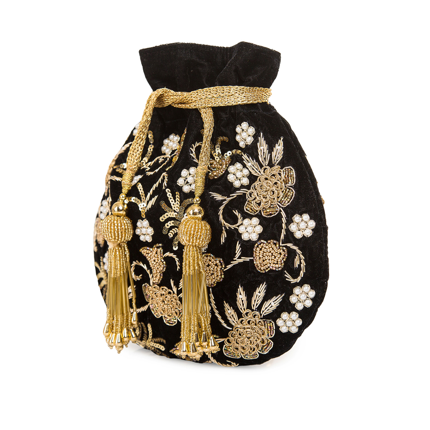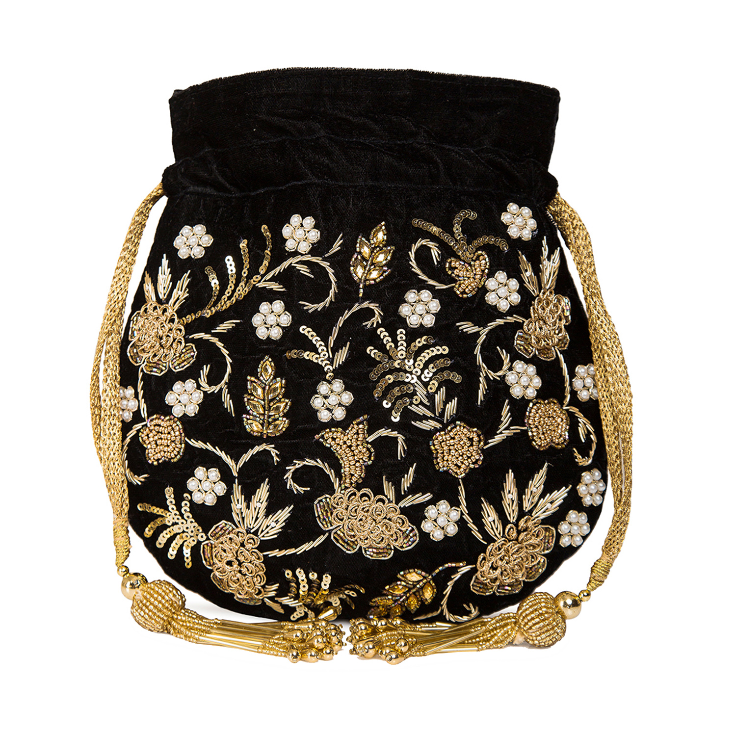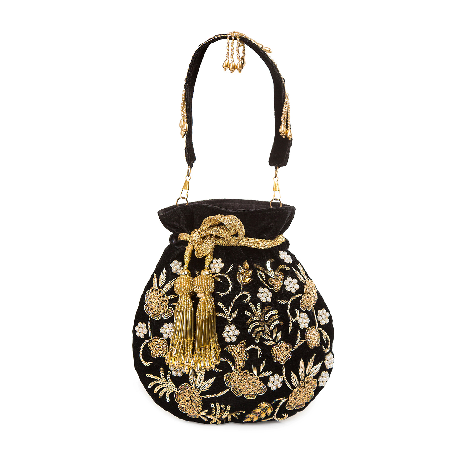 MATERIAL : Hand Work on Black Velvet, Pearls, Gold Zardozi, Gold Sequins, Gold Cut Stones & Beads, Gold Beaded Dori With Tassels, Black Poly – Silk Lining, Optional Black Handle With Tassels. This handcrafted product is ready to ship.