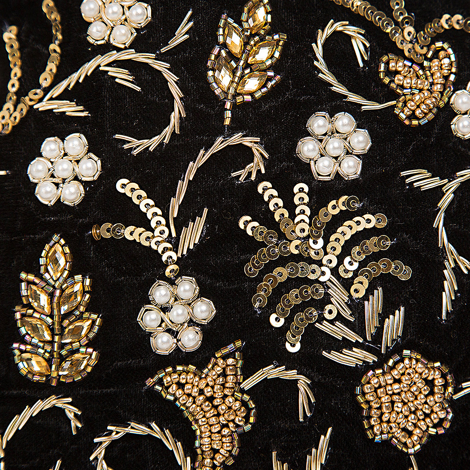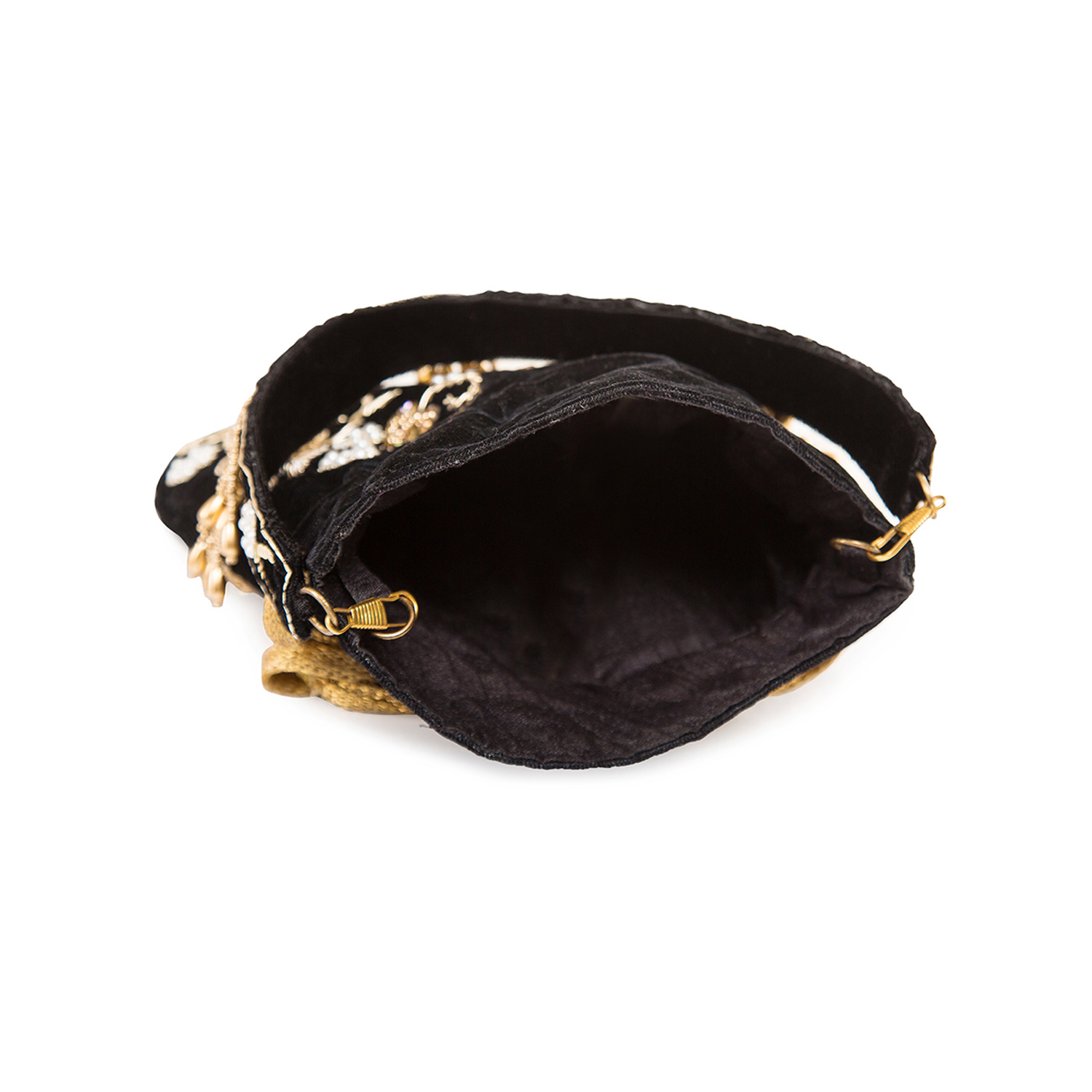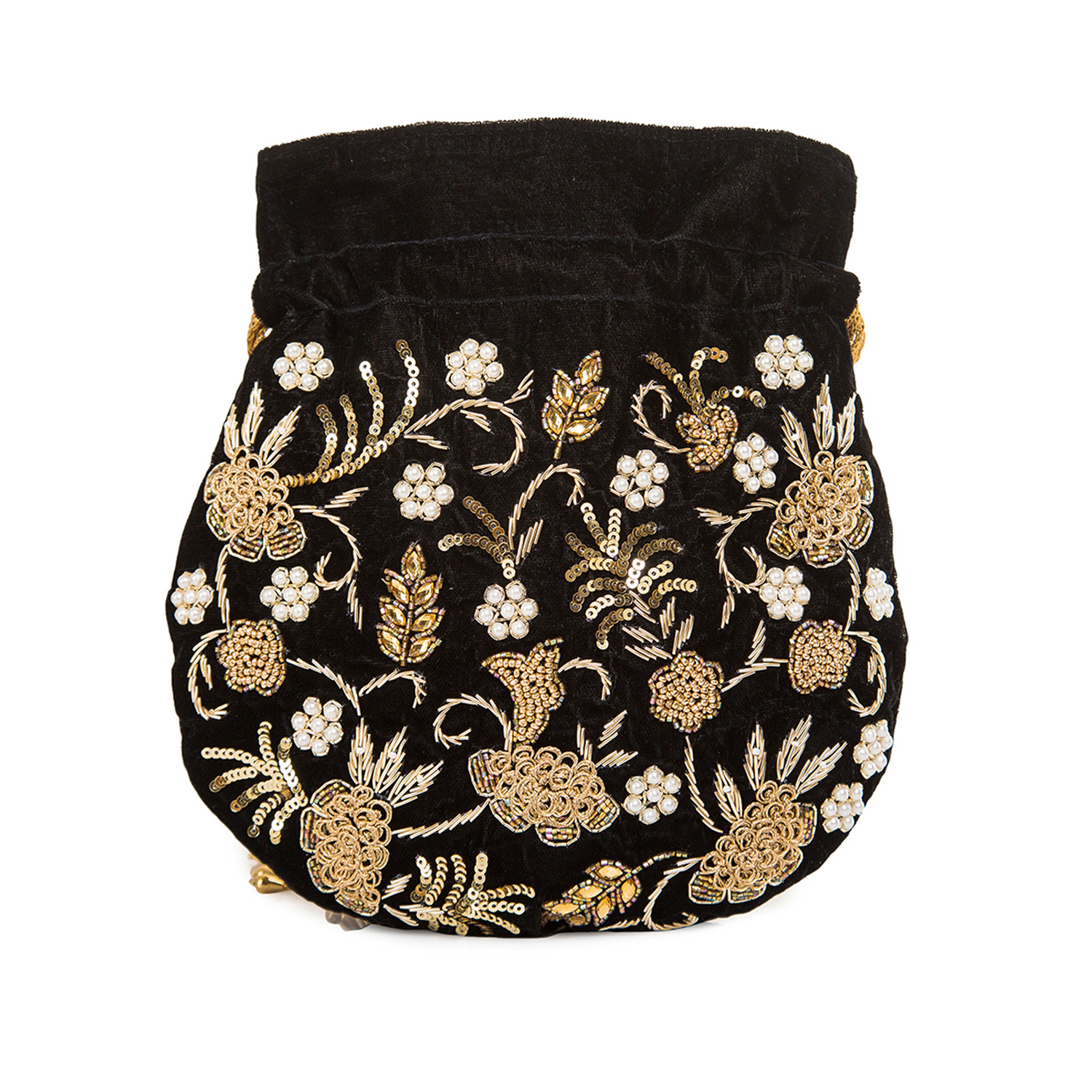 MATERIAL : Hand Work on Black Velvet, Pearls, Gold Zardozi, Gold Sequins, Gold Cut Stones & Beads, Gold Beaded Dori With Tassels, Black Poly – Silk Lining, Optional Black Handle With Tassels. This handcrafted product is ready to ship.