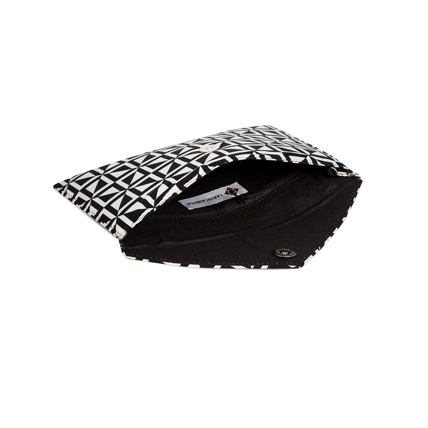 MATERIAL : Black And White Print, Black Poly – Dupion Lining, Silver Magnetic Button Clasp, Silver Chain. This handcrafted product is ready to ship.