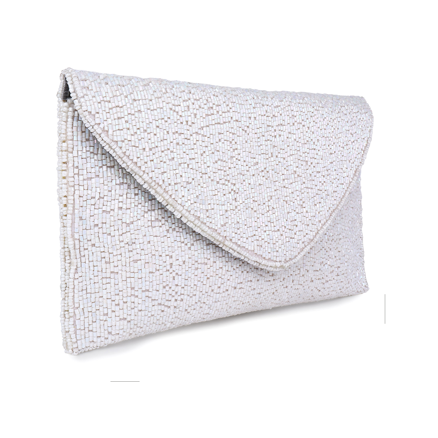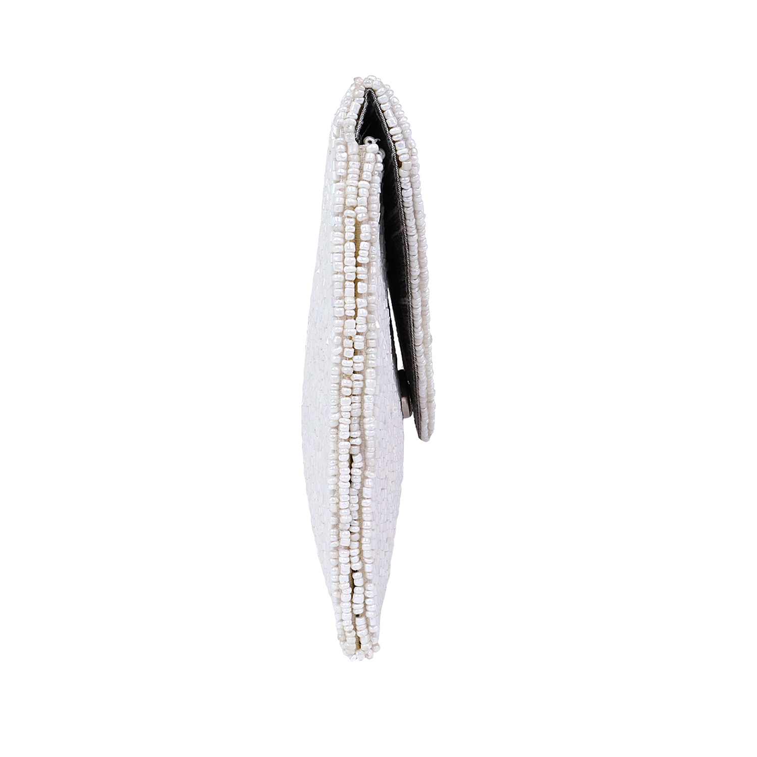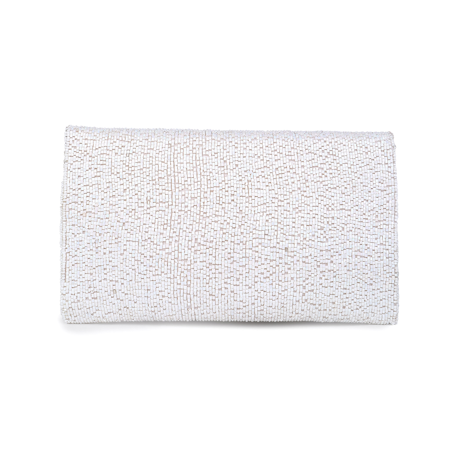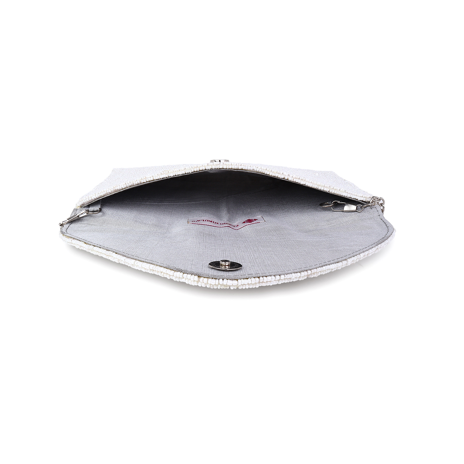MATERIAL: White Cut Bead work, White Poly – Silk Lining, Silver Chain, Magnetic Button, Can accomodate an phone 14 and more. This handcrafted product is ready to ship.